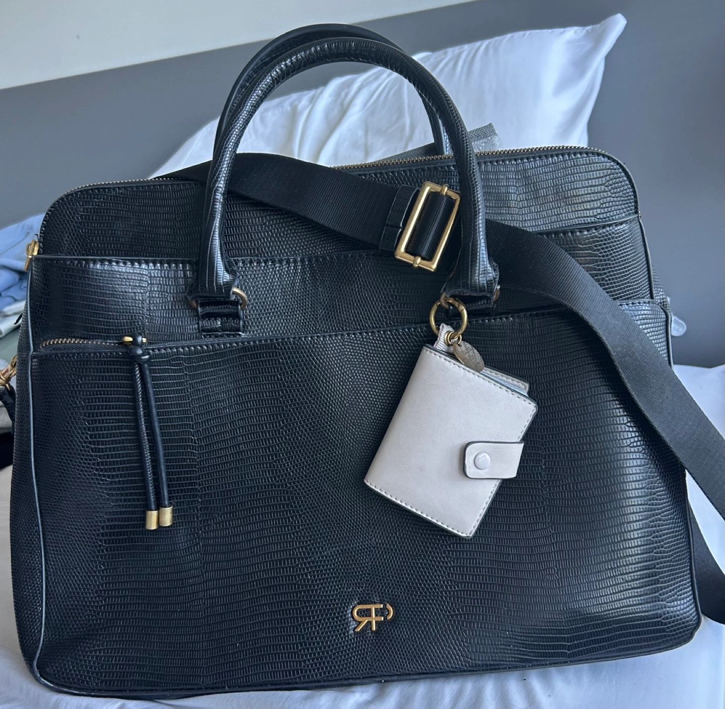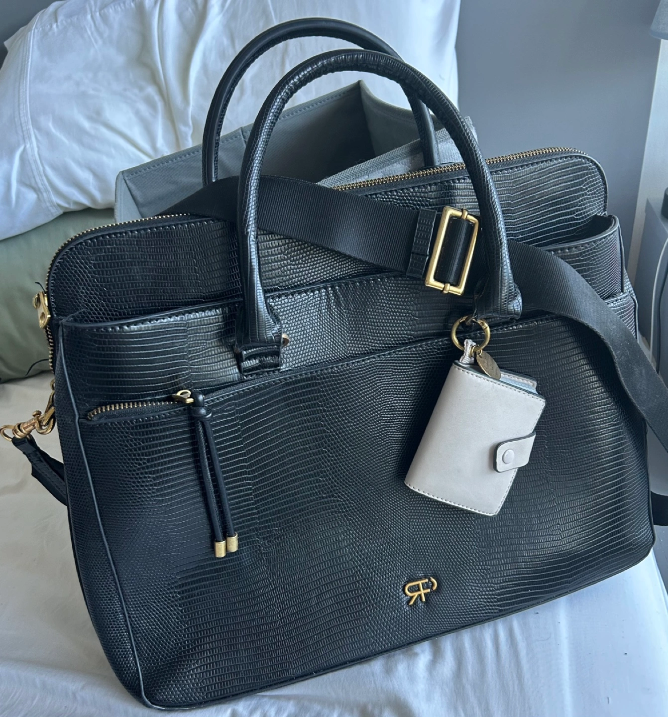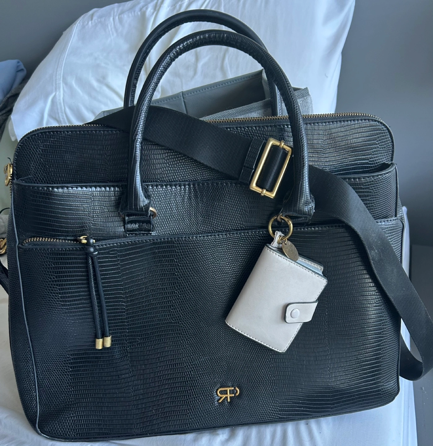 Black briefcase, snakeskin texture. Features two top handles, detachable shoulder strap, and multiple compartments. Gold-tone hardware. Includes small off-white wallet. Laptop fits in the front compartment. Perfect for work.