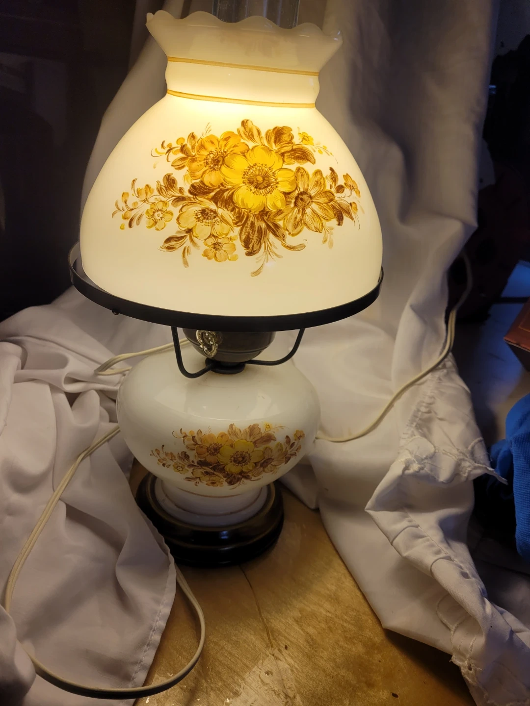 This vintage table lamp features a white glass shade adorned with a yellow floral design. It has a white glass base, also with a working light! with matching floral accents. Includes a clear glass chimney and a CFL bulb. Perfect for adding a touch of retro charm to any room!