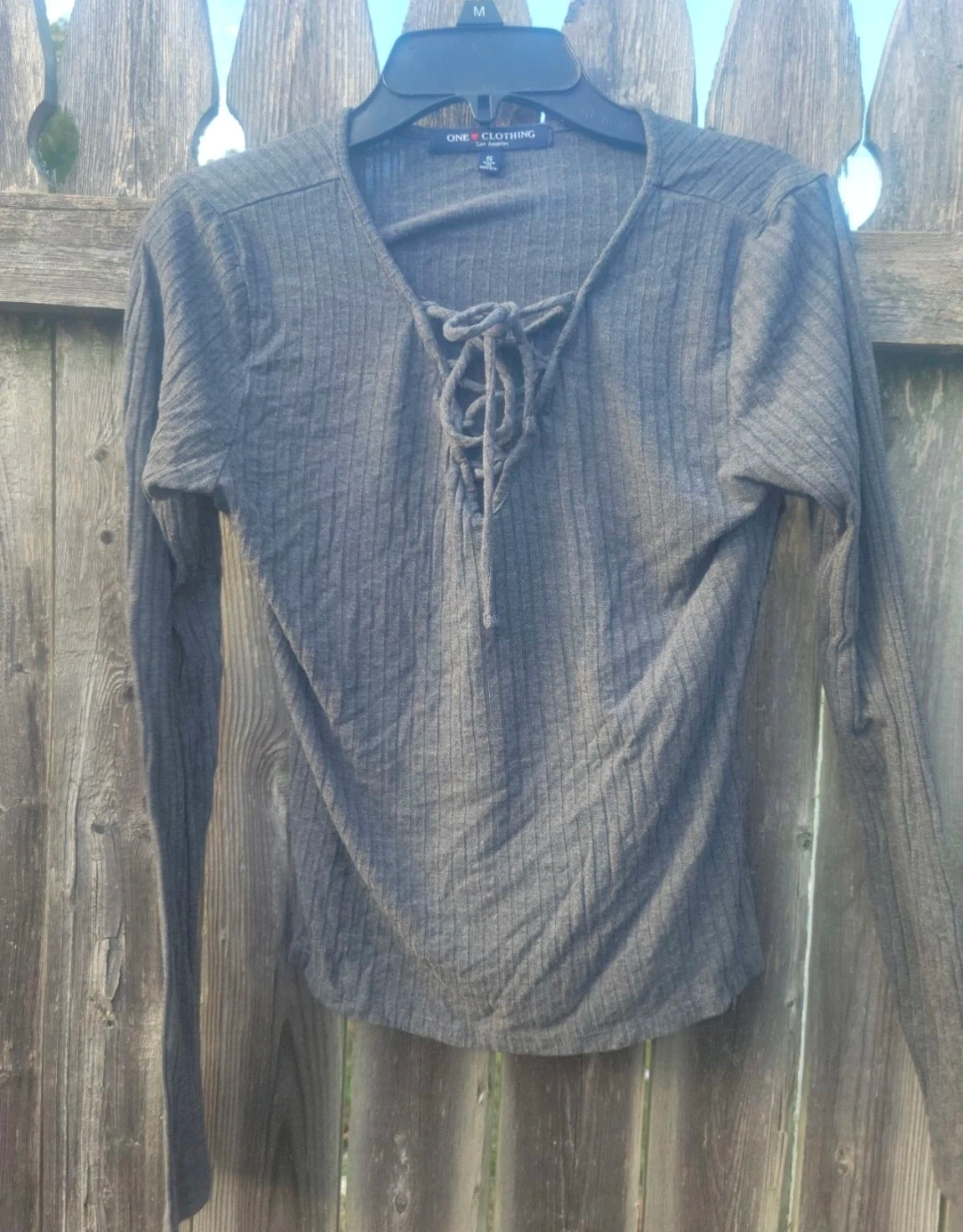 ONE CLOTHING long sleeve top with a lace-up detail at the neckline. Ribbed texture throughout. Made in Mexico. Size is small.