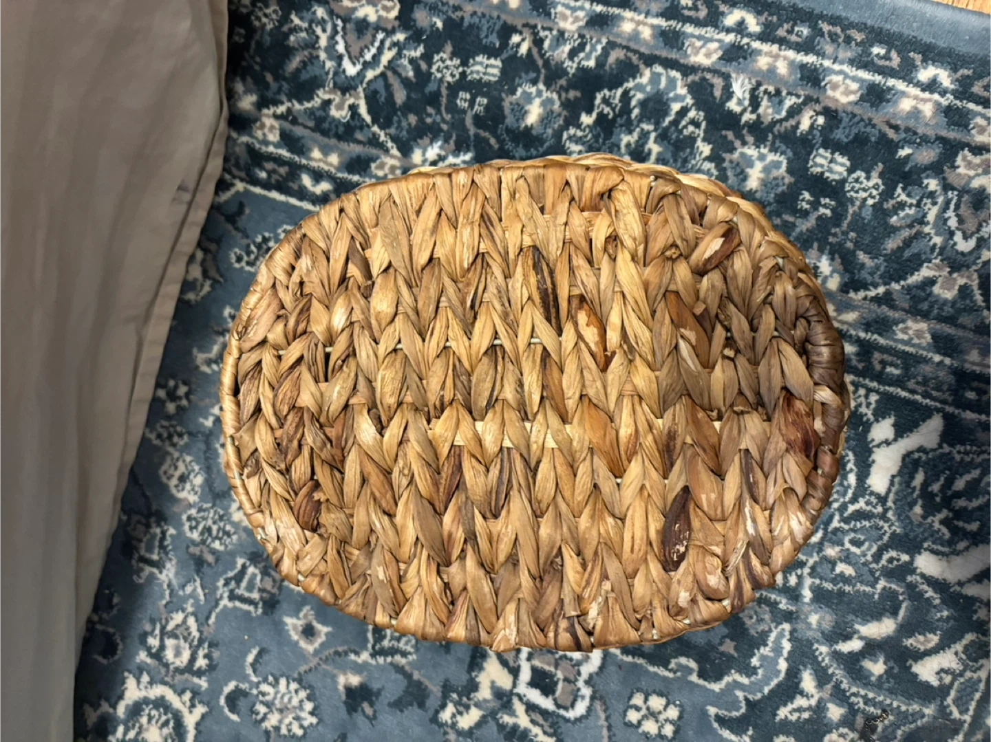 Oval woven basket made from natural fibres. It has two sturdy handles for easy carrying. This basket is perfect for storing blankets, toys, or other household items. Natural woven material.