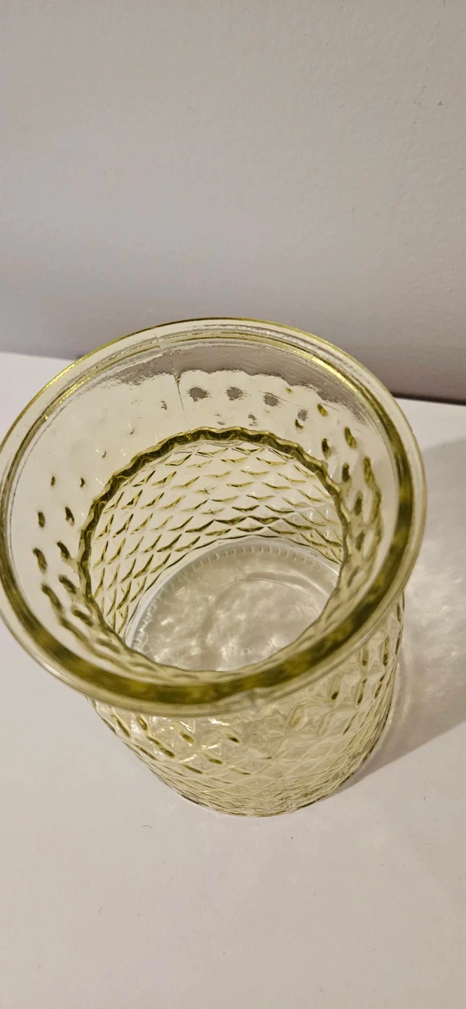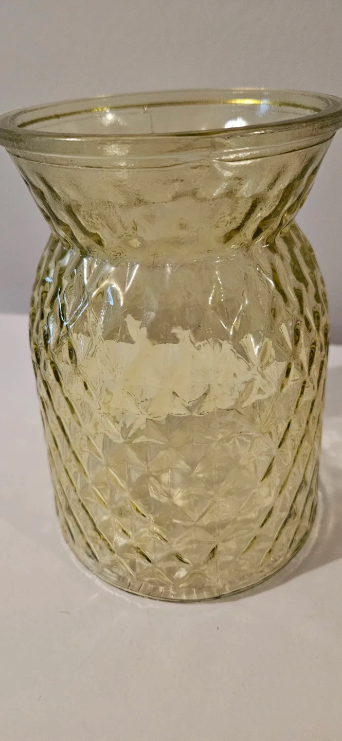 This is a diamond cut glass vase in a yellow hue. The flower display looks beautiful in this vase. Glass material.