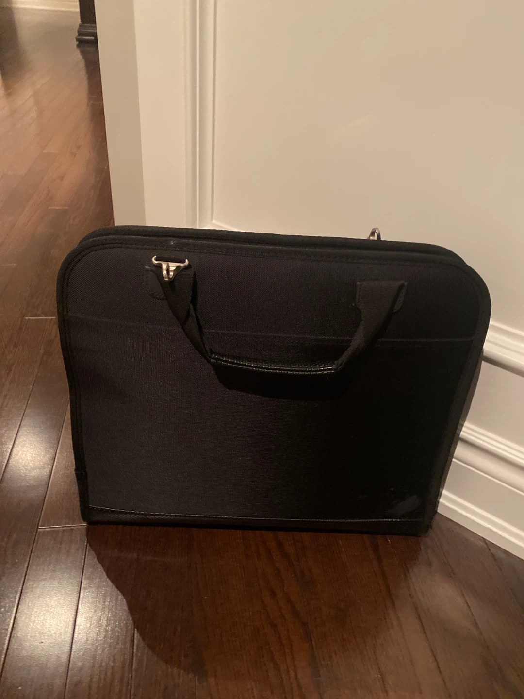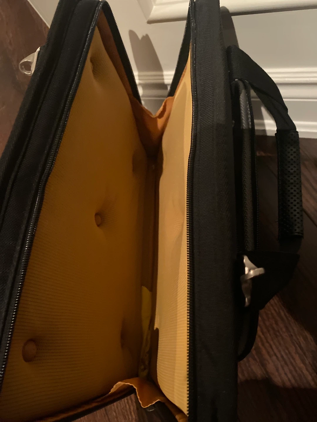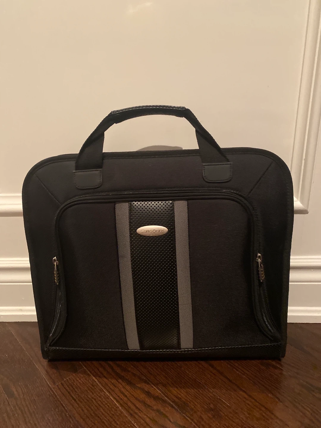This is a black Samsonite briefcase with a padded interior and handle. It's suitable for carrying a laptop and documents. The exterior is made of durable fabric.