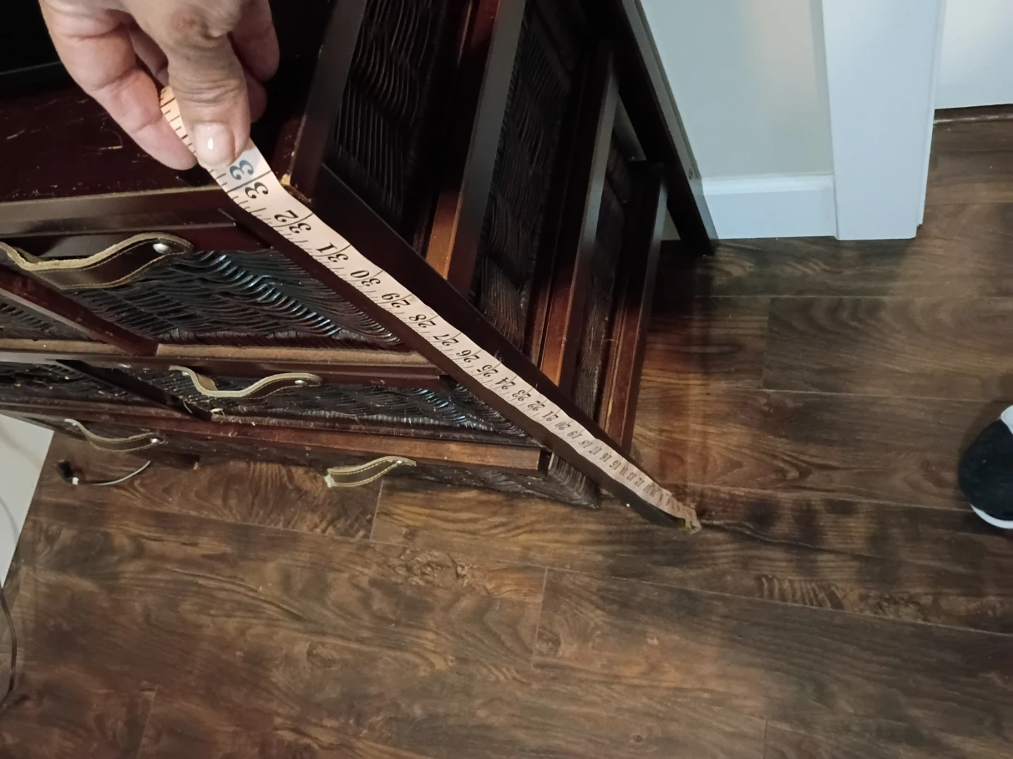 A dark wood storage cabinet featuring six wicker baskets. It's about 33 inches tall. Two of the top baskets have some damage, but most are still functional for storage.