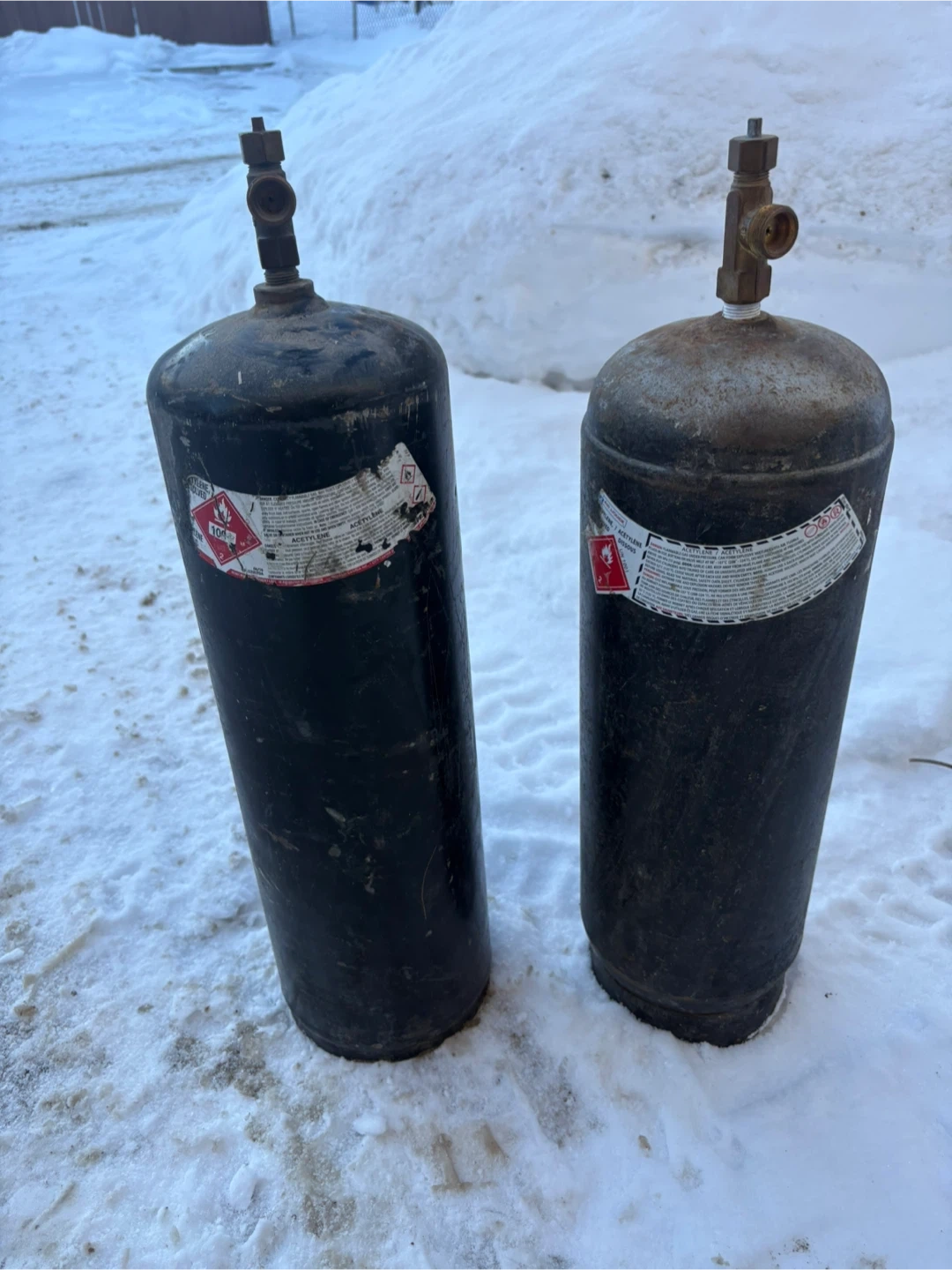 Two industrial acetylene gas cylinders for your welding needs. These tanks are heavy-duty steel construction. Great for a welding shop or portable welding setup!