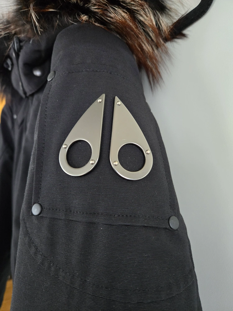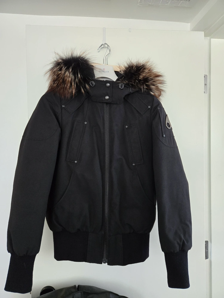 Women's black bomber jacket. Features a fur-trimmed hood and signature Moose Knuckles branding. Size Medium. Excellent condition.