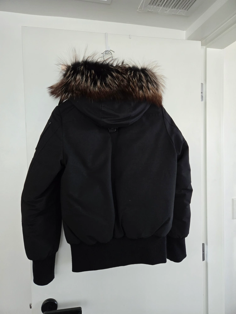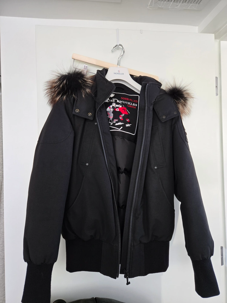 women Moose Knuckles Black Bomber Jacket with Fur Hood