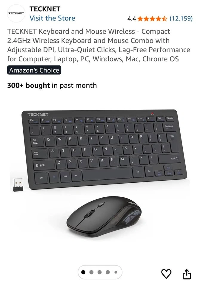 Compact 2.4GHz wireless keyboard and mouse combo with adjustable DPI. Features ultra-quiet clicks and lag-free performance. Works with computers, laptops, PCs, and is compatible with Windows, Mac, and Chrome OS.