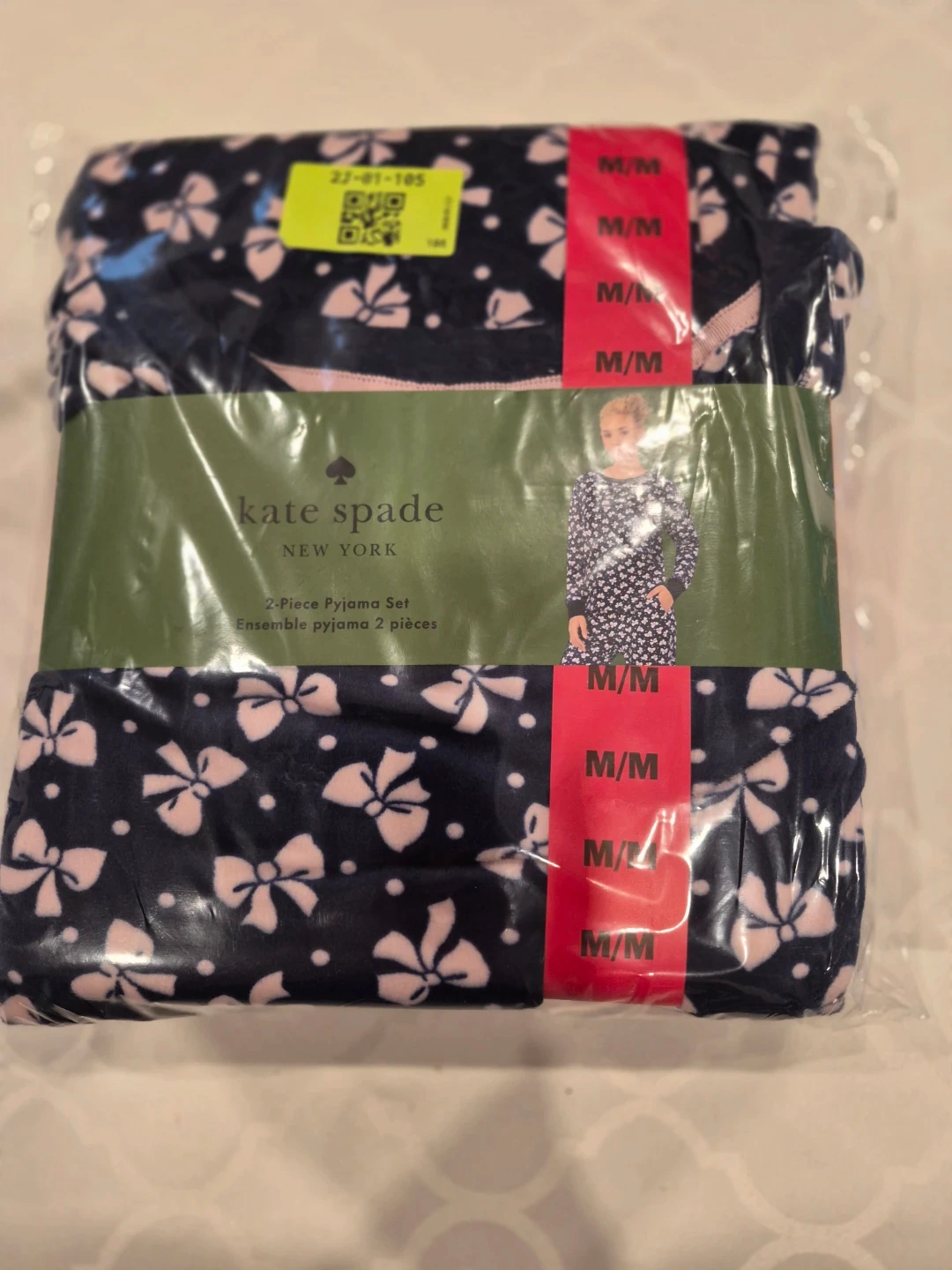 This is a new Kate Spade New York 2-piece pyjama set. It features a navy blue background with a pink bow and polka dot pattern. The size is medium.