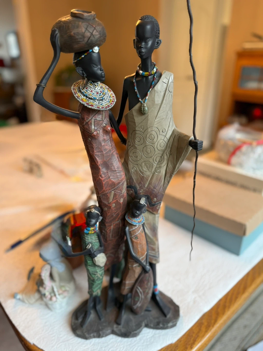 Decorative figurine depicting an African family. Features detailed clothing and beaded accessories. Made of resin material.