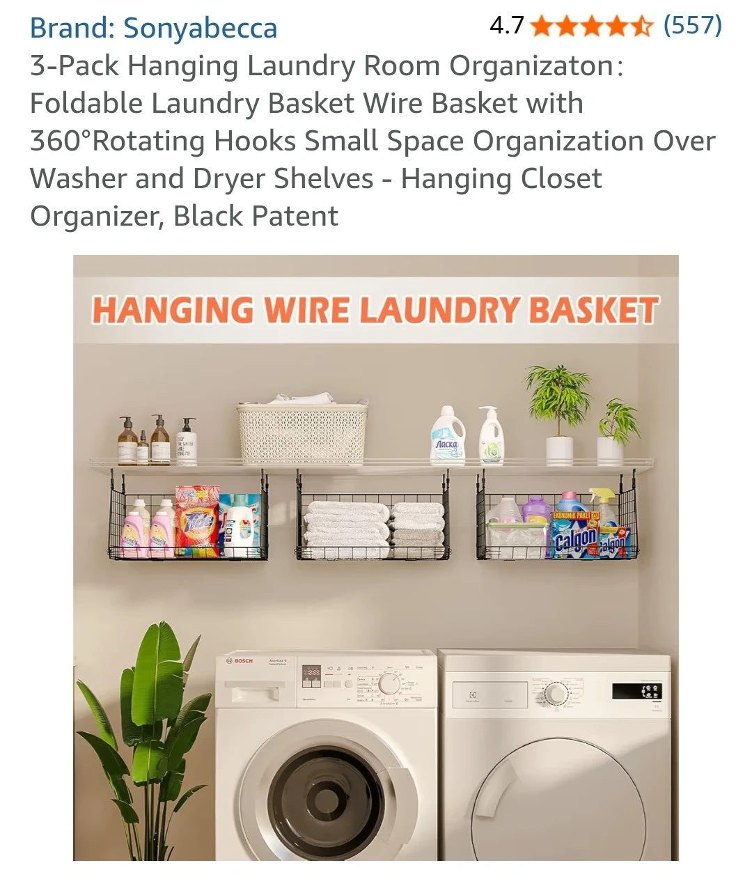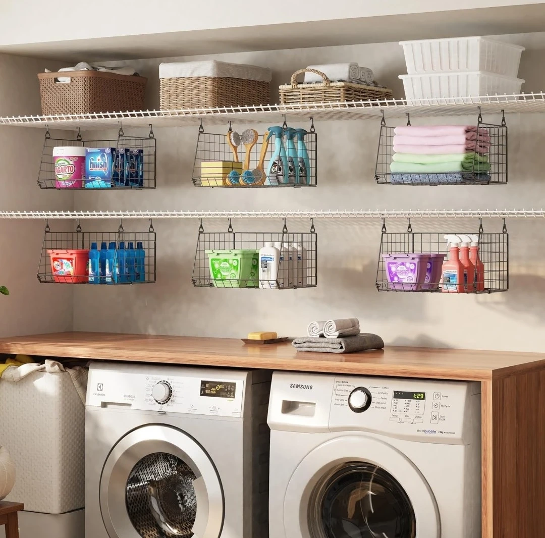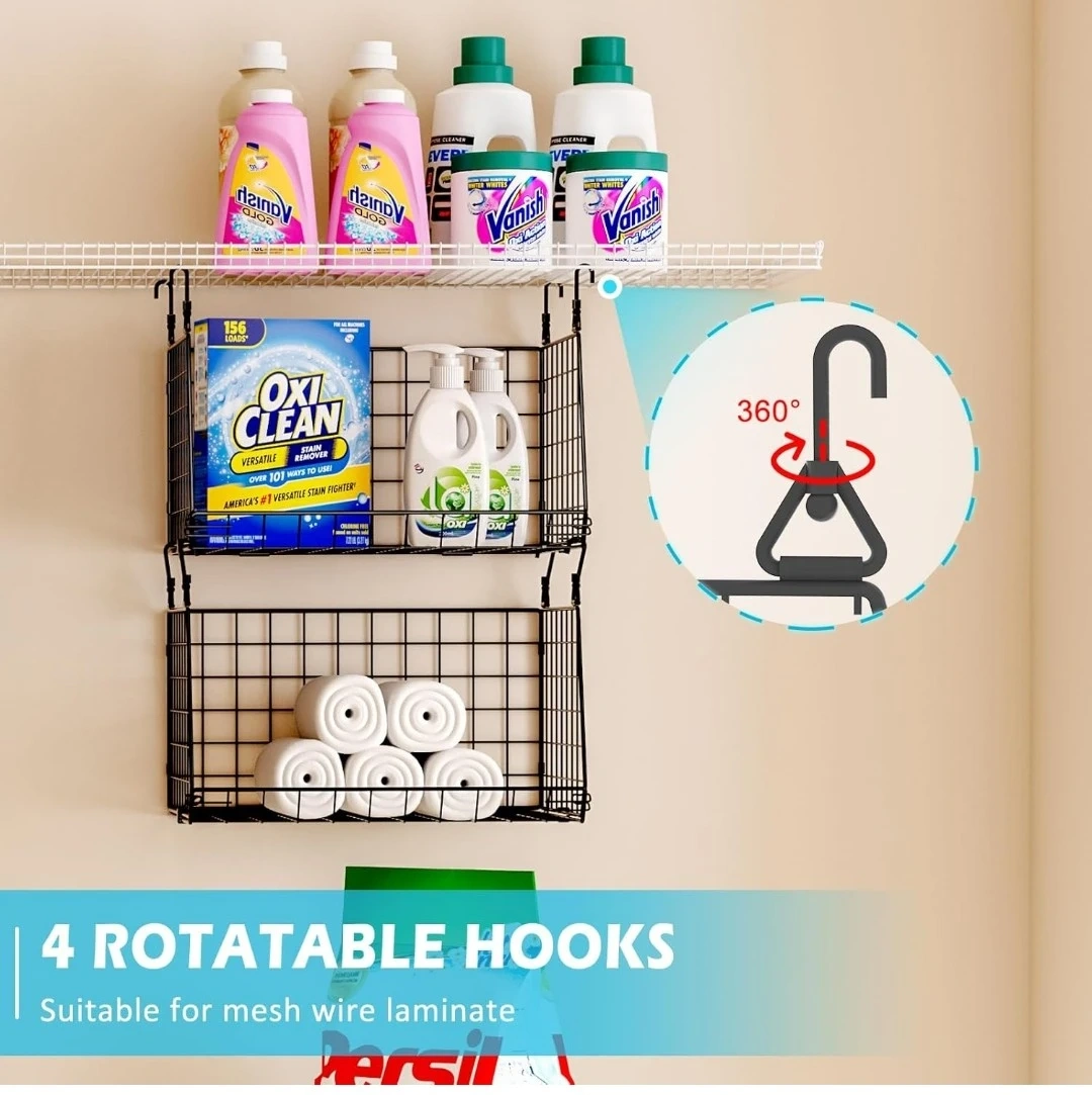 This 3-pack of hanging wire baskets is perfect for organizing small spaces. They feature 360° rotating hooks and can be hung over washer and dryer shelves. Ideal for closets and laundry rooms!