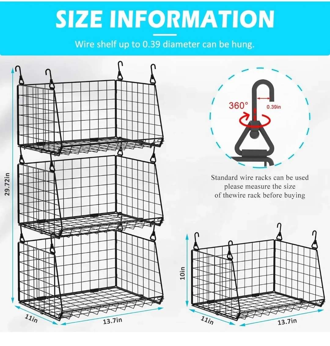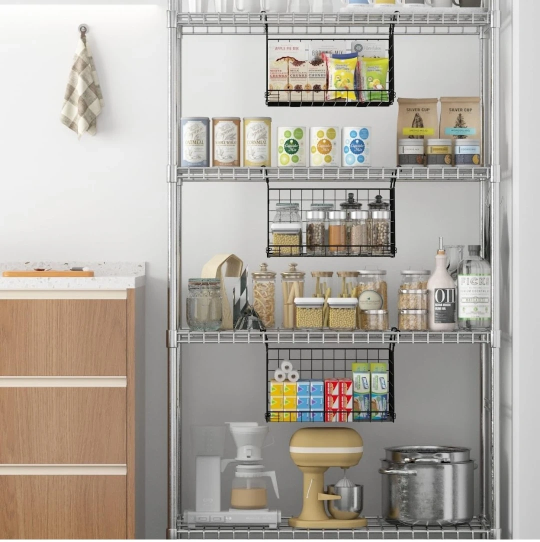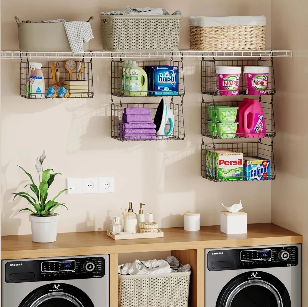 This 3-pack of hanging wire baskets is perfect for organizing small spaces. They feature 360° rotating hooks and can be hung over washer and dryer shelves. Ideal for closets and laundry rooms!