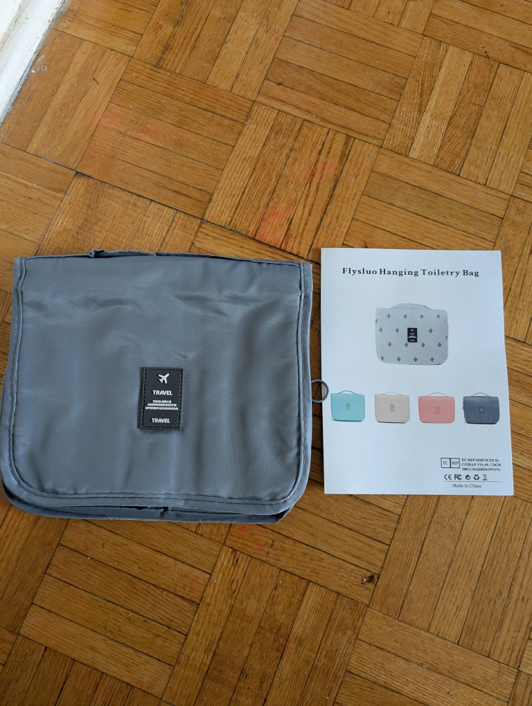 Hanging toiletry bag. Has multiple compartments for your essentials. Great for keeping things organized while travelling.