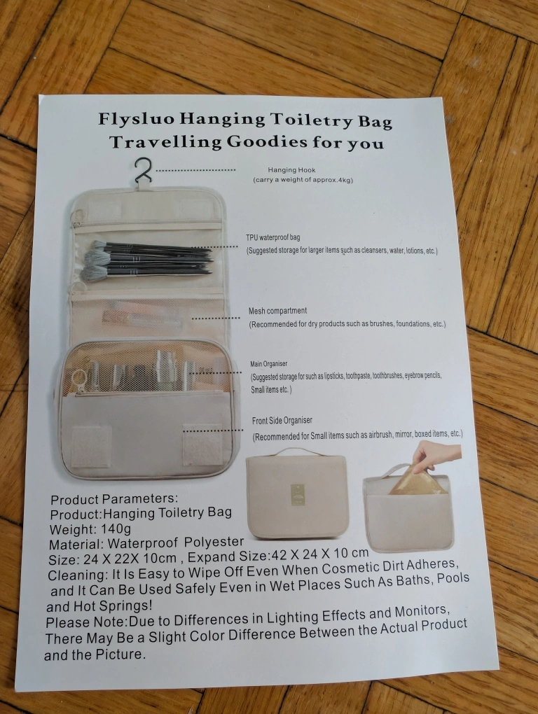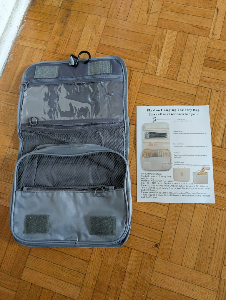 Hanging toiletry bag. Has multiple compartments for your essentials. Great for keeping things organized while travelling.