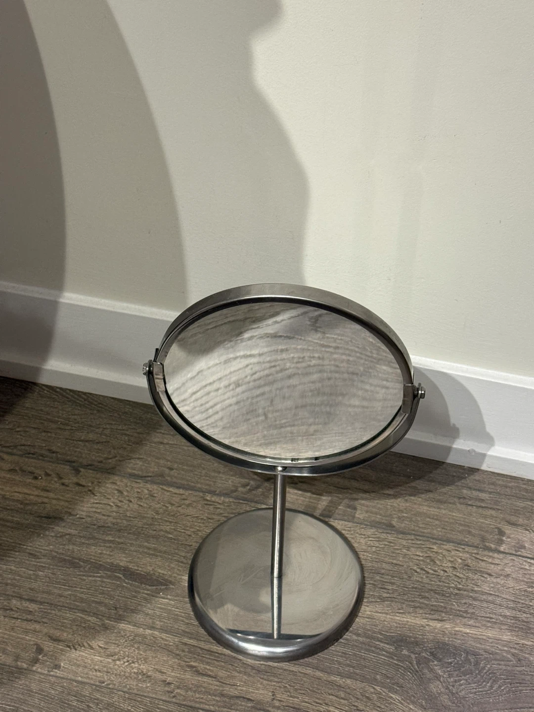 This is a tabletop vanity mirror with a metal finish. It has a round base and an adjustable arm. Perfect for your makeup or grooming needs!