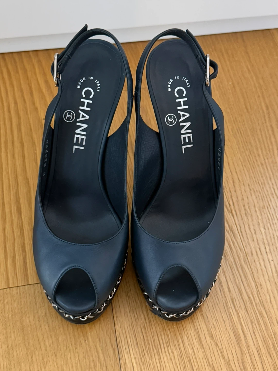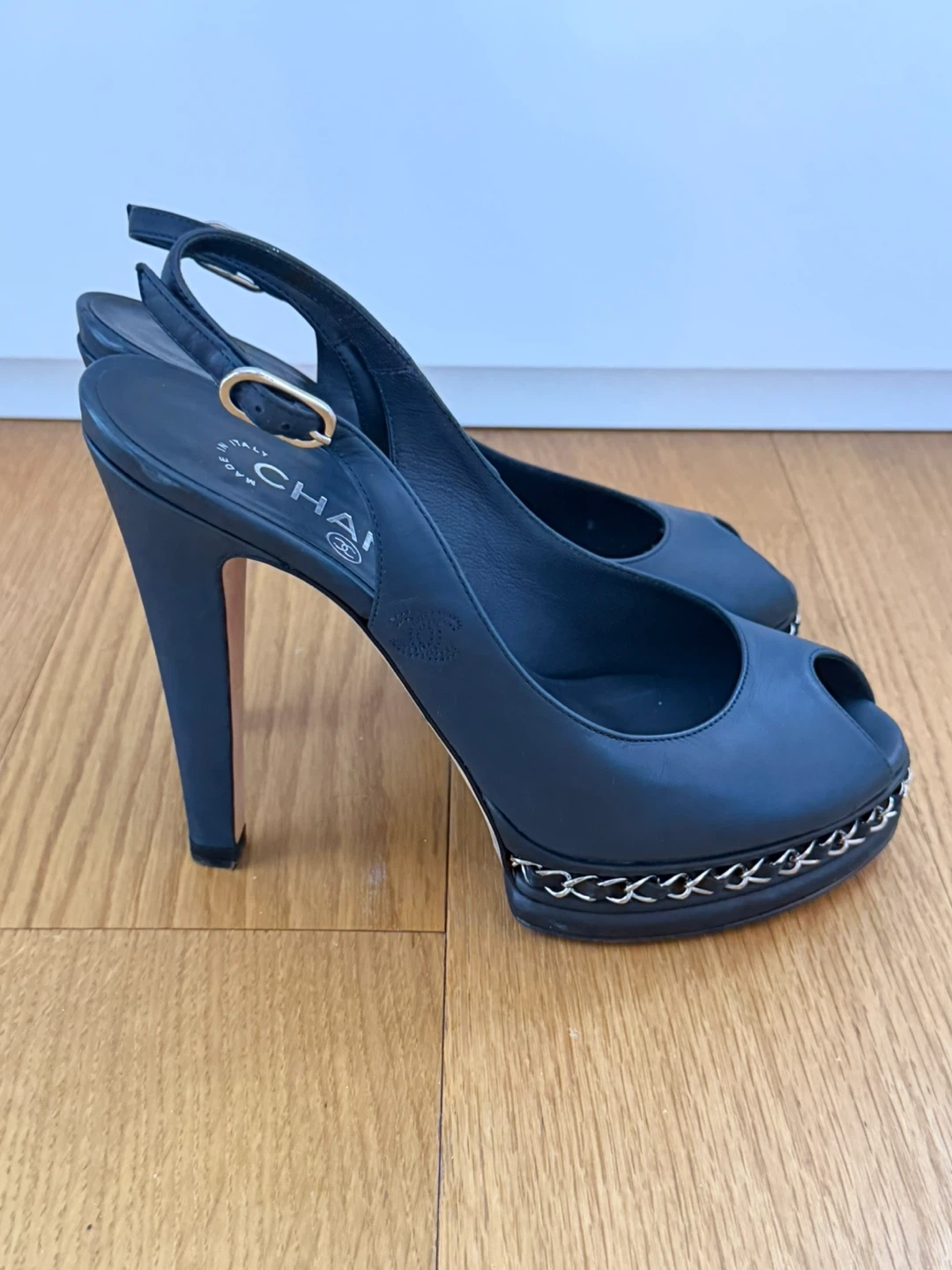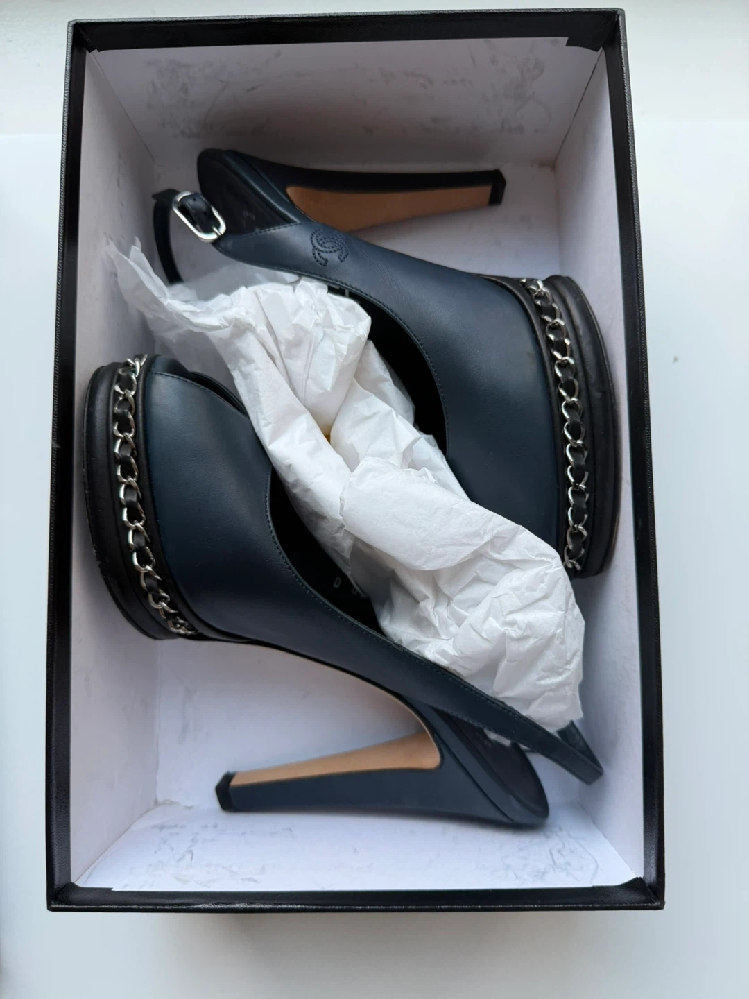Selling a pair of Chanel slingback heels in size 37. They come with the original box! These elegant heels feature a stylish chain detail around the platform. Please see photos for condition.