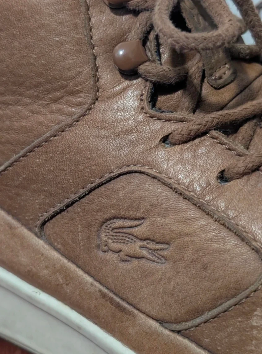 These are brown leather mid-top sneakers by Lacoste. They're a size 9.5 Genuine leather upper with a rubber sole.