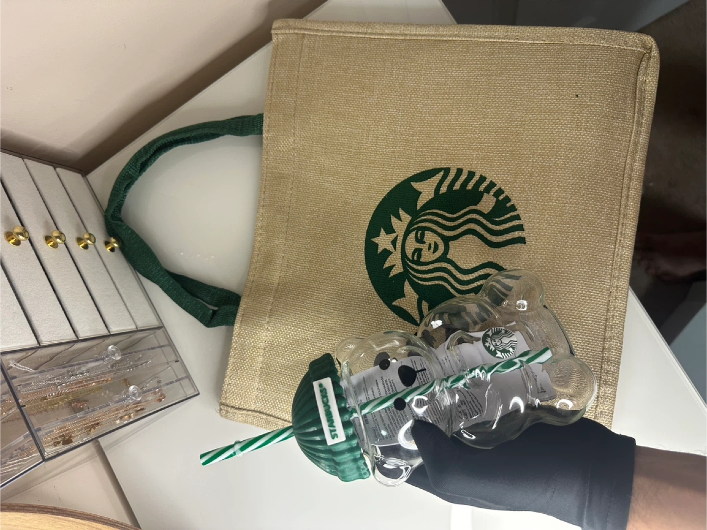 This is a clear Starbucks tumbler shaped like a bear. It comes with a green lid and a straw. A beige canvas tote bag with the Starbucks logo is also included. It's a fun collectible item from Starbucks!