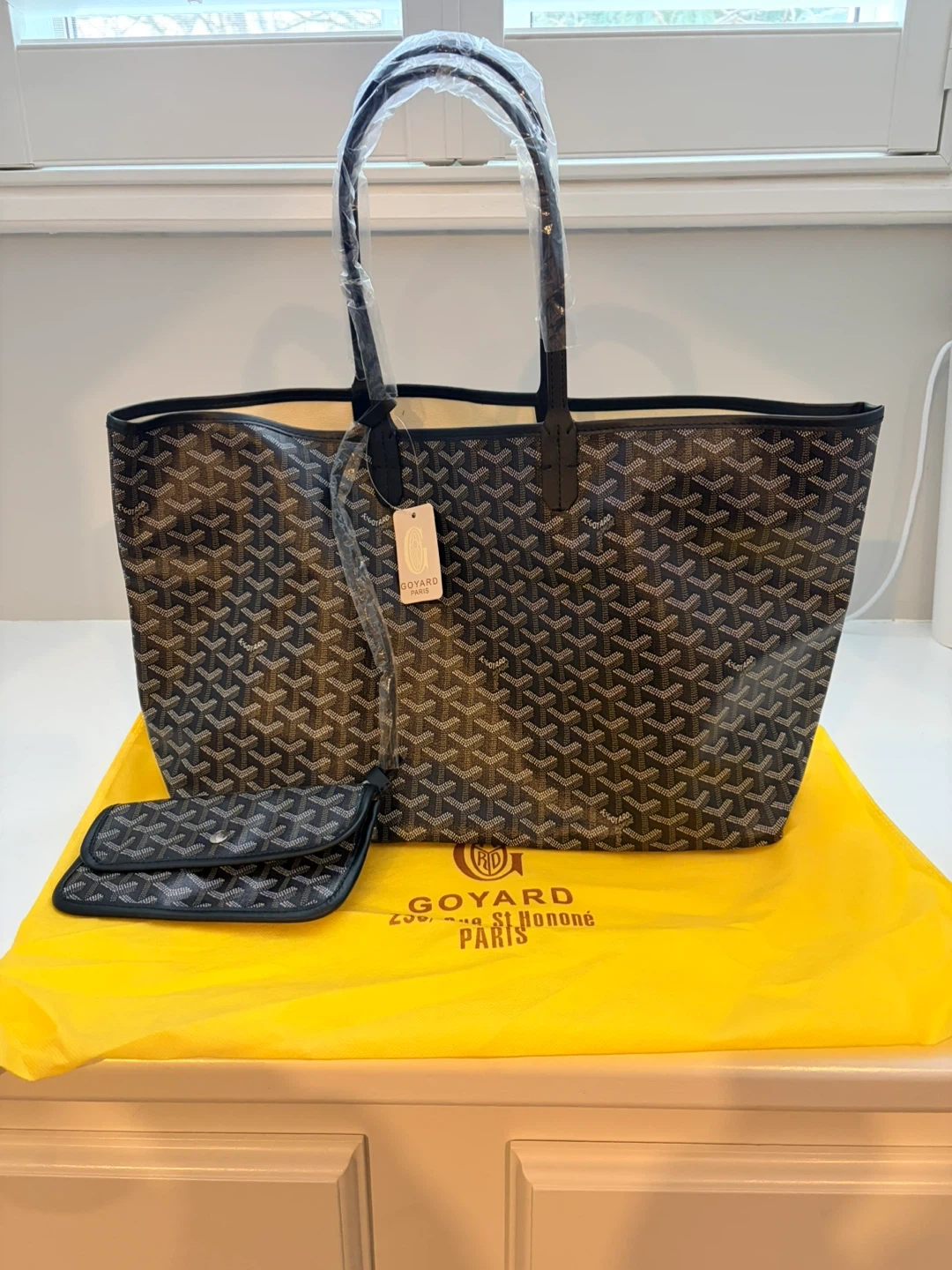 Selling a beautiful Goyard tote bag in black! It comes with a matching pouch and the original yellow dust bag. This stylish and functional bag is perfect for everyday use. The iconic Goyard design is sure to turn heads!