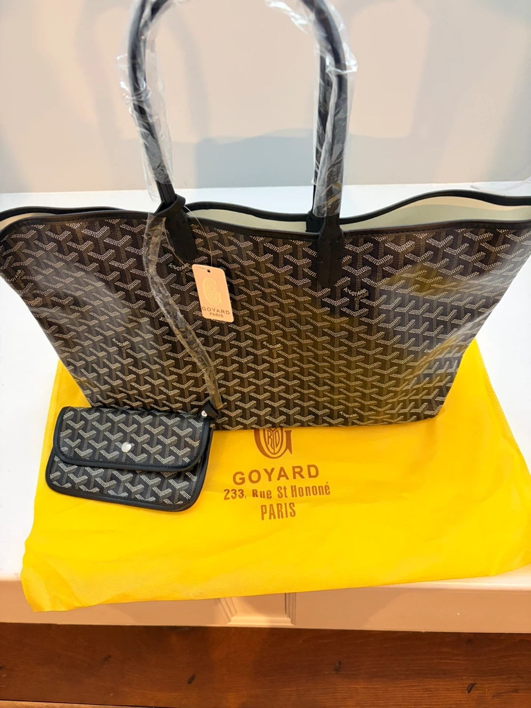 Selling a beautiful Goyard tote bag in black! It comes with a matching pouch and the original yellow dust bag. This stylish and functional bag is perfect for everyday use. The iconic Goyard design is sure to turn heads!