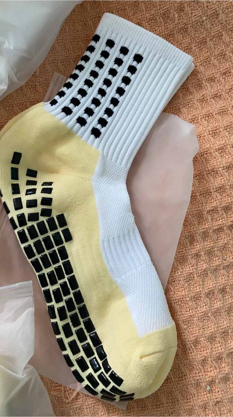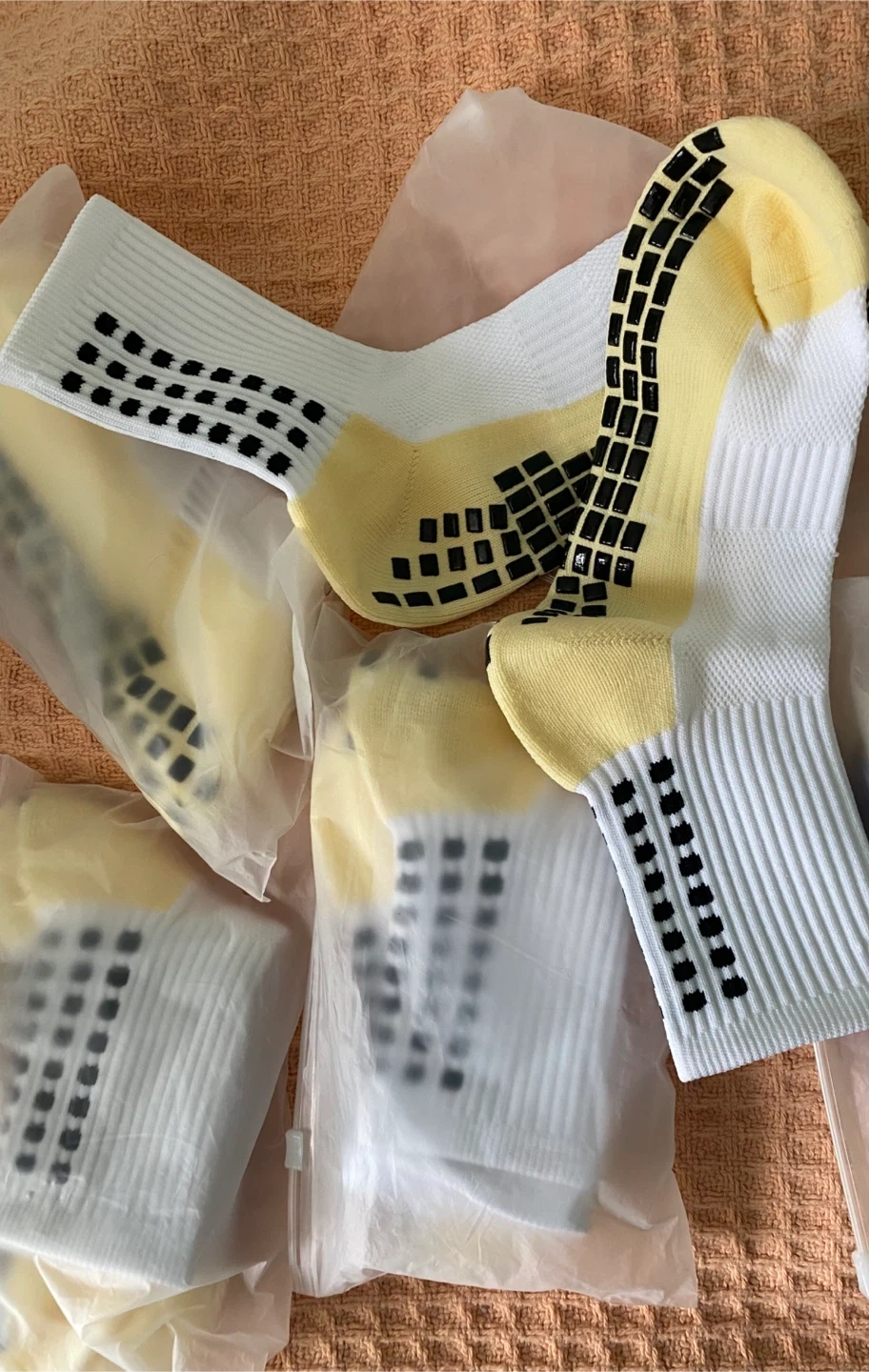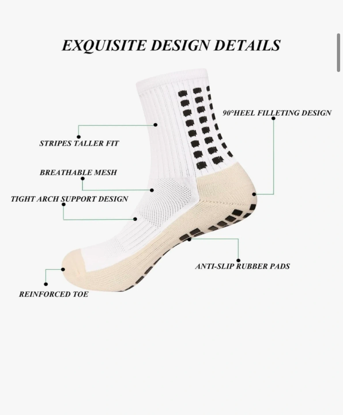 Get a better grip with these white soccer socks featuring anti-slip rubber pads. They're designed for a tighter fit and offer arch support. The breathable mesh keeps your feet cool during play!