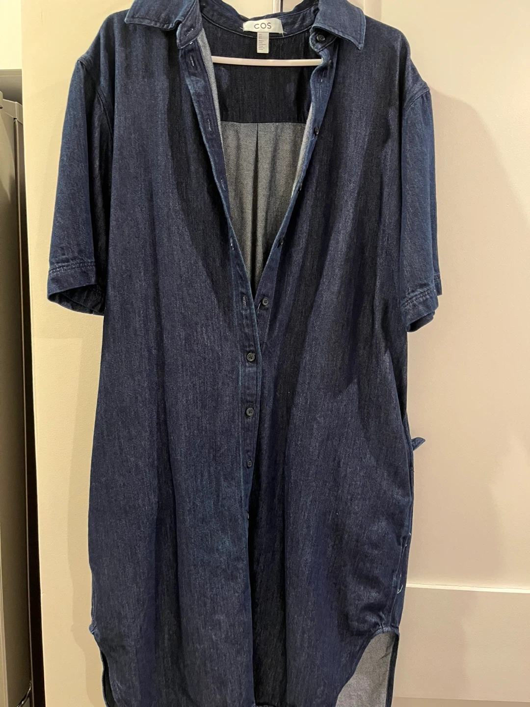 This is a COS denim shirt dress. It's dark wash with a button-down front and short sleeves. The material is denim.