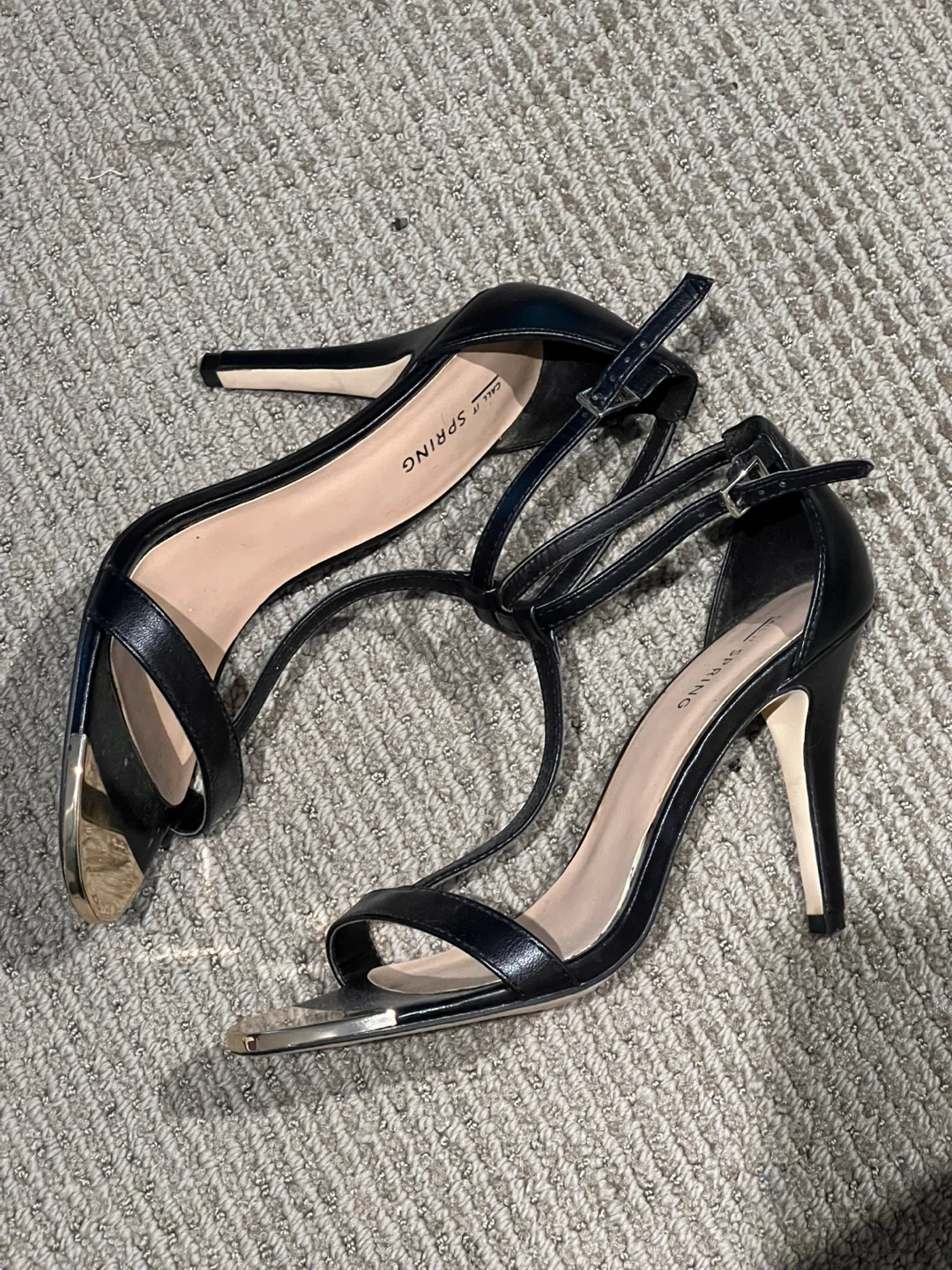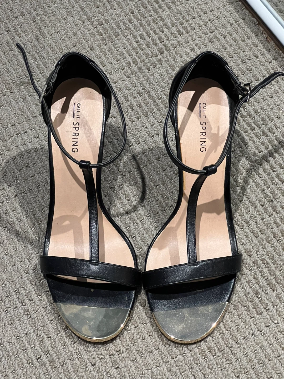 Selling a pair of Call It Spring black heels. They have a T-strap design and a gold accent on the toe. Have only worn twice. Size 8.5