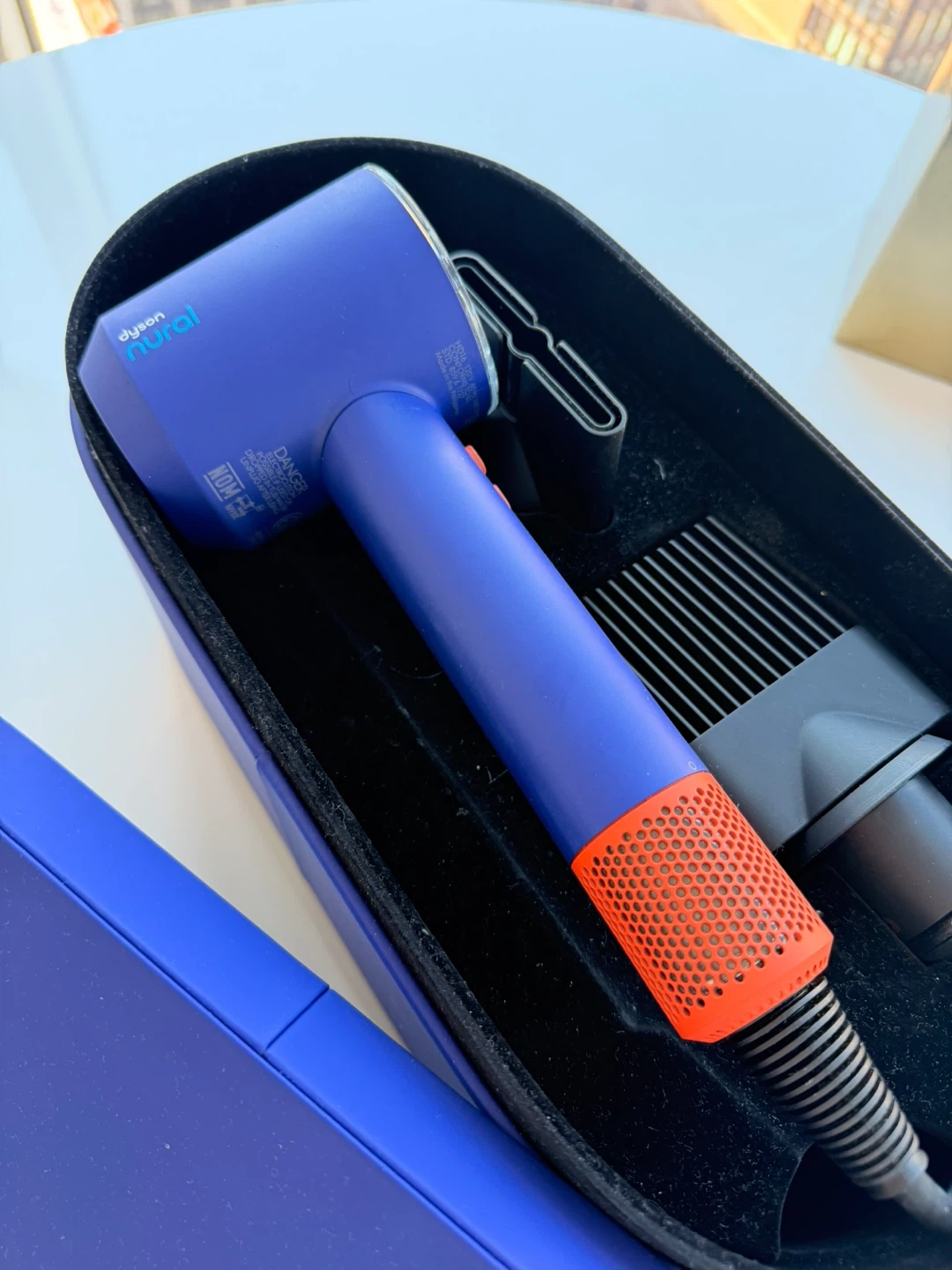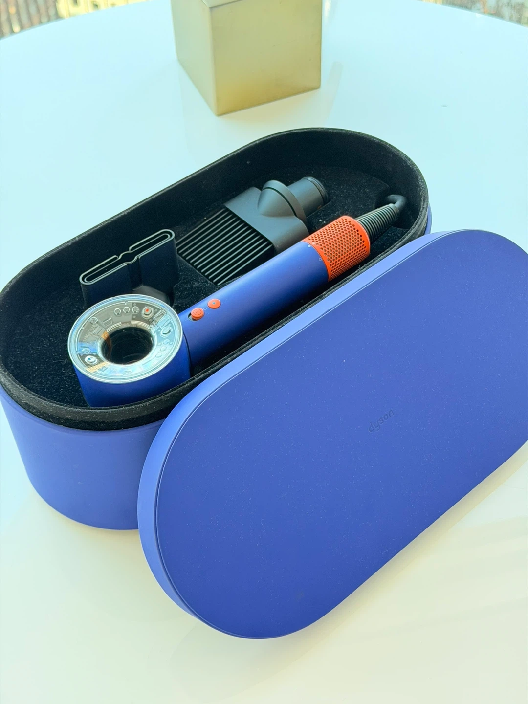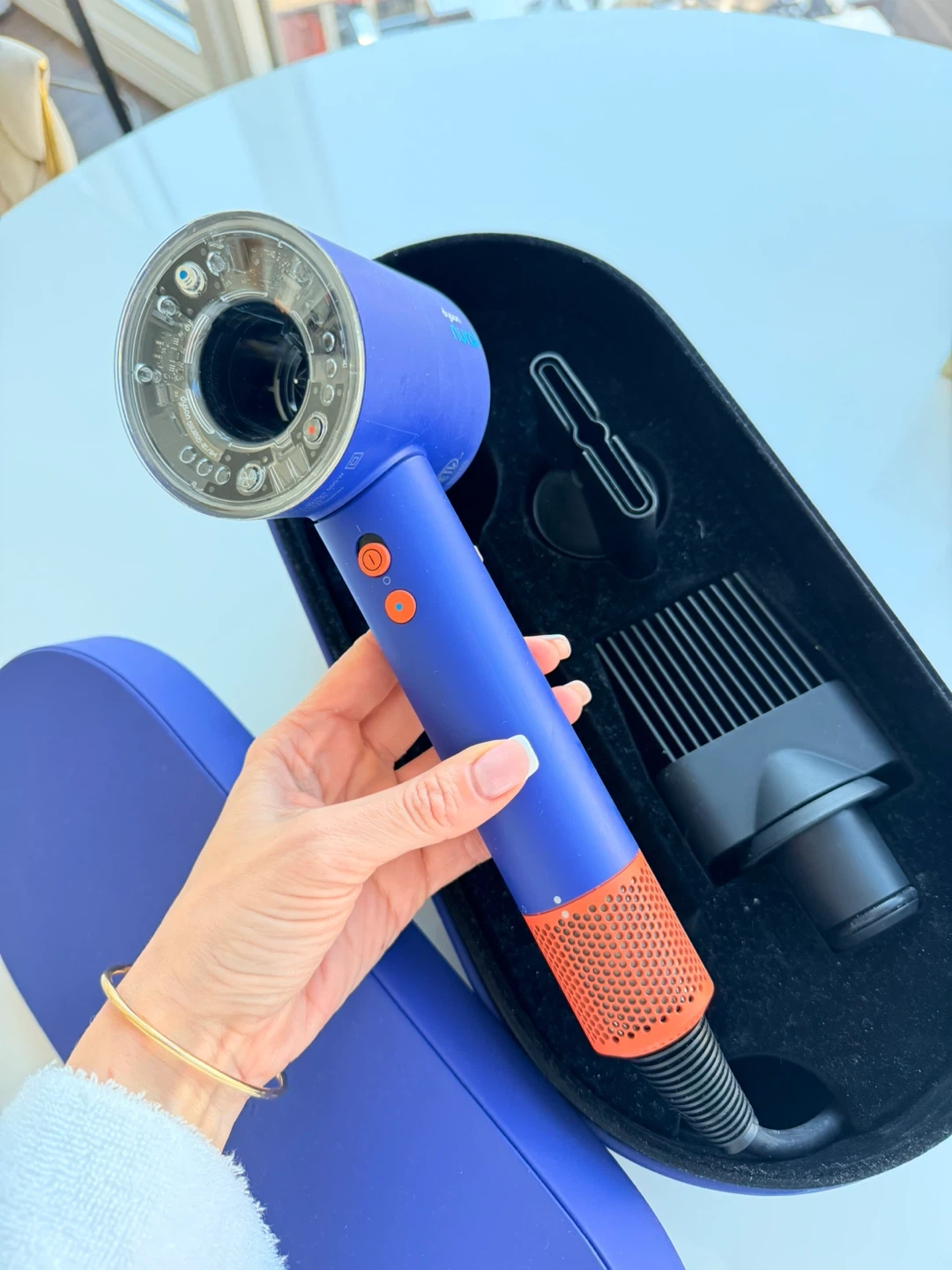 This is a blue Dyson Supersonic hair dryer with orange accents. It comes with a storage case and attachments. It's designed for powerful and fast drying.