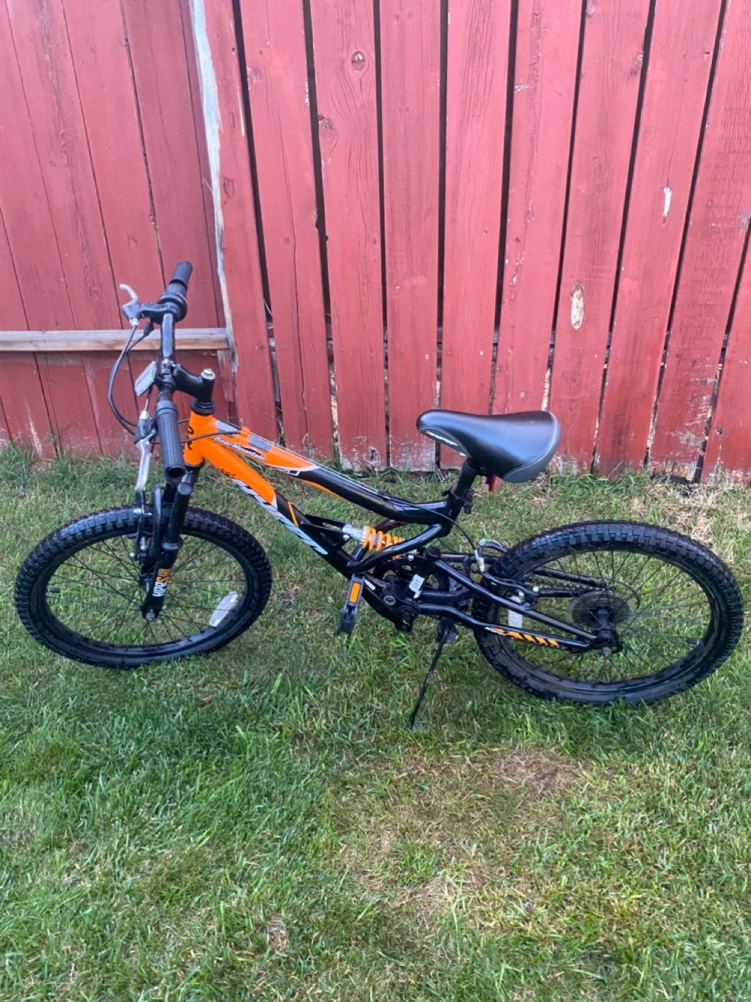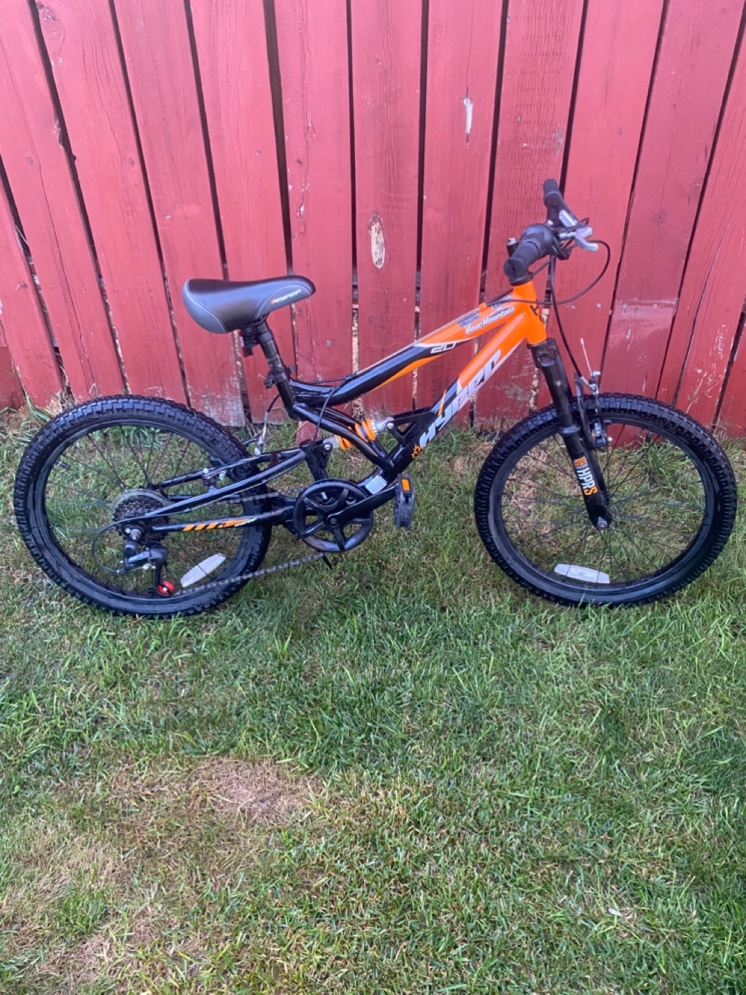 Selling a bear mountain bike in orange and black. It looks to be in good condition and ready for some outdoor adventures! For kids. The bike has dual suspension.