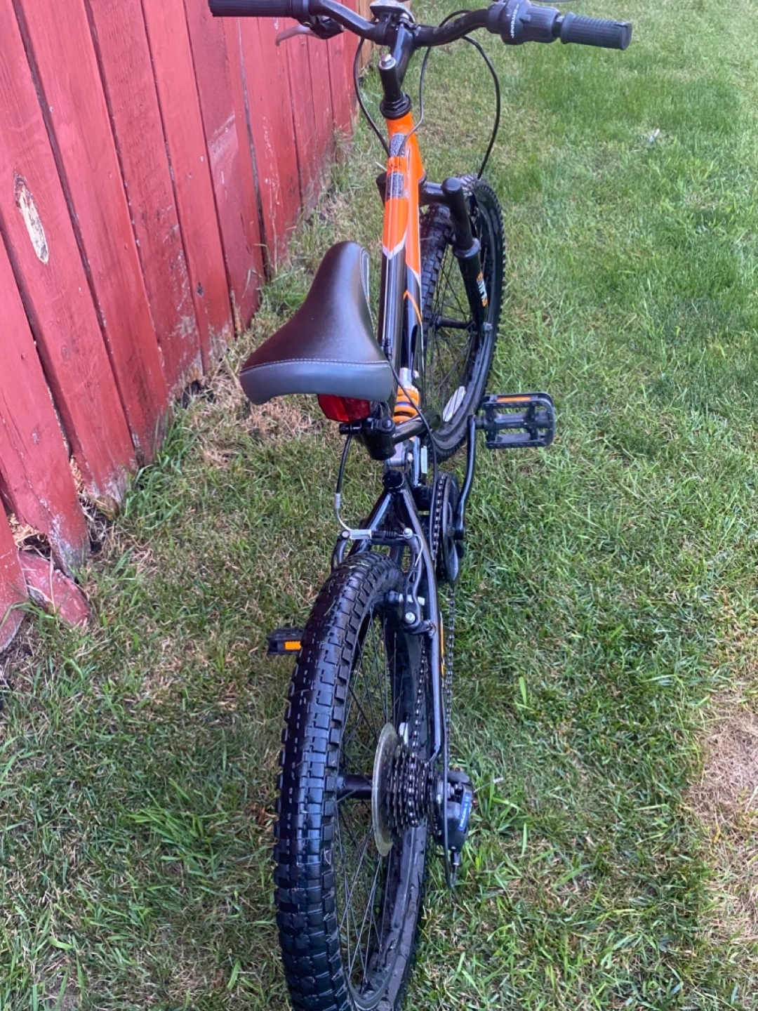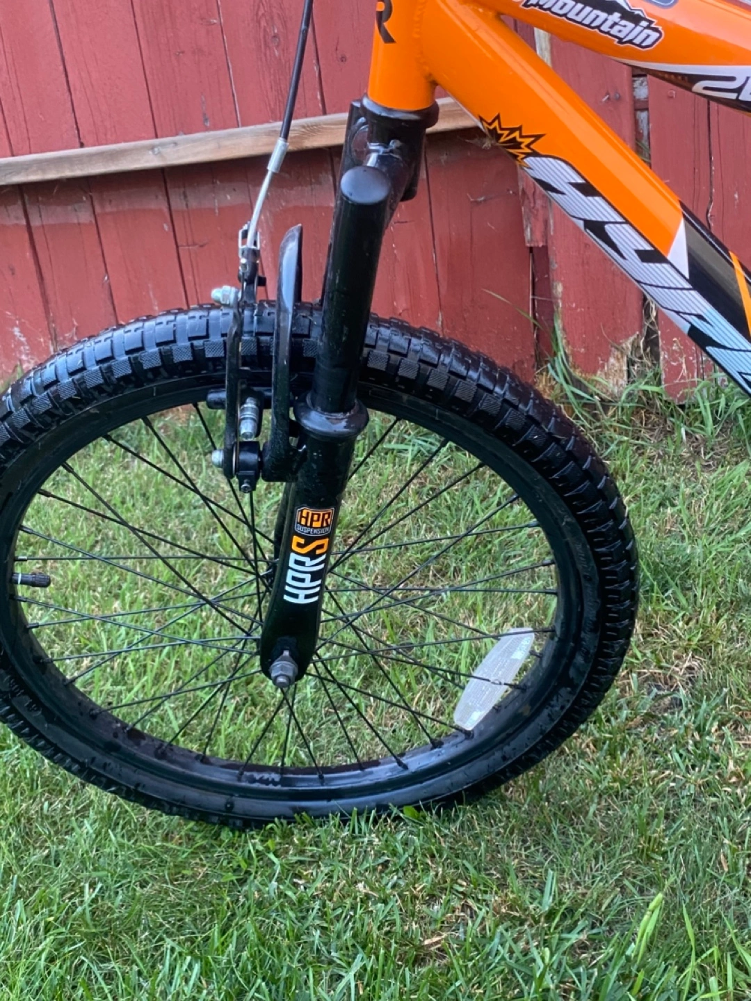 Selling a bear mountain bike in orange and black. It looks to be in good condition and ready for some outdoor adventures! For kids. The bike has dual suspension.