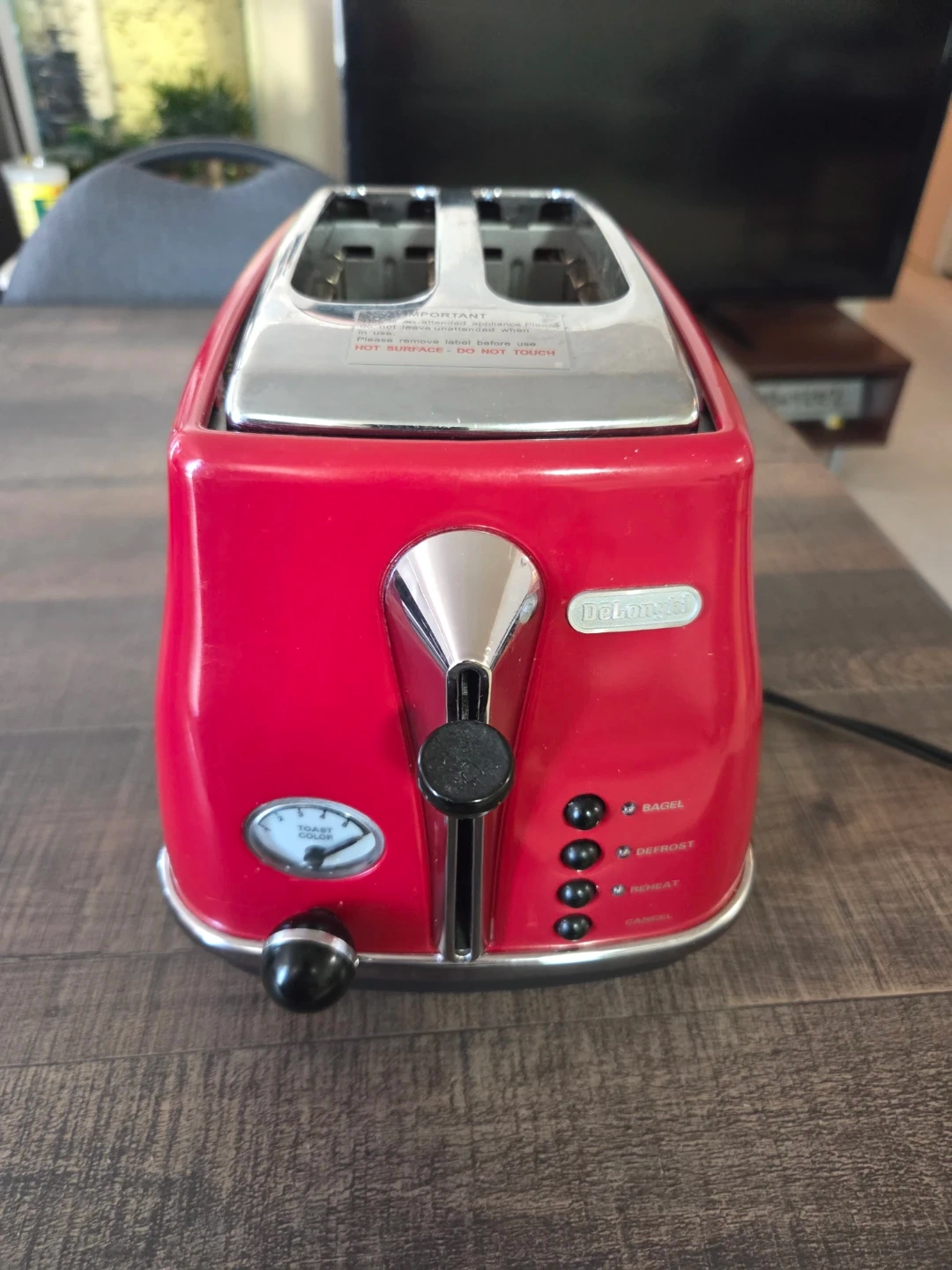 This is a DeLonghi 2-slice toaster in bright red. It features adjustable toast colour settings, and buttons for bagel, defrost, and reheat functions. It's perfect for quick breakfasts or snacks!