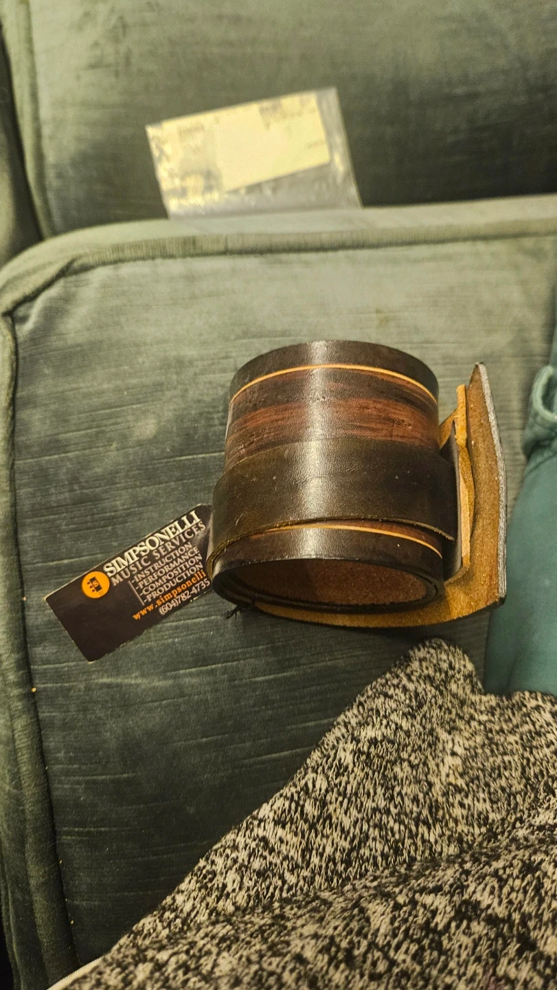 Brown leather wristband with layered detail. Made by Simpsonelli Music Services. Offers instruction, performance, and production services.