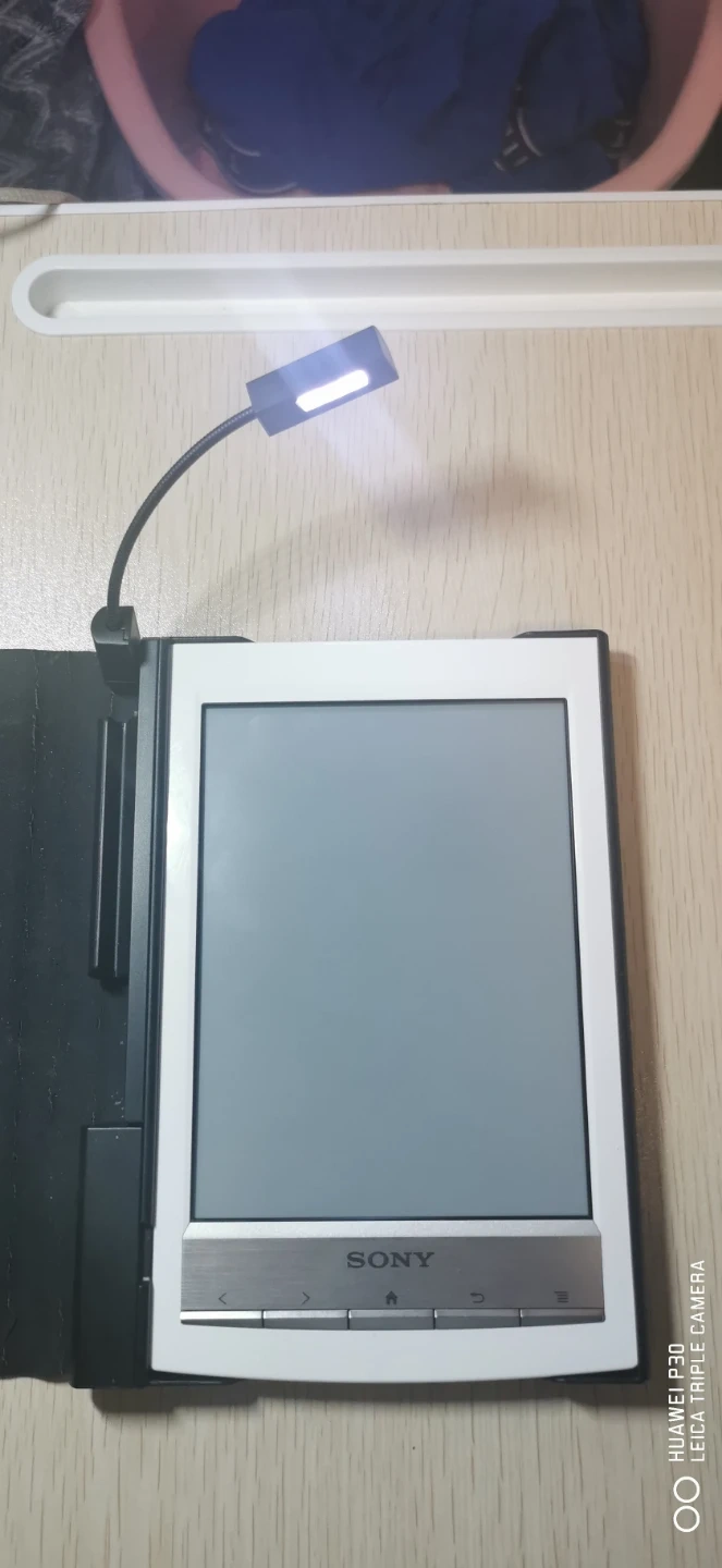 This Sony Reader PRS-T1 digital book reader is white and comes with a black cover. It's a portable device for reading e-books. A handy light is attached for reading in low light.