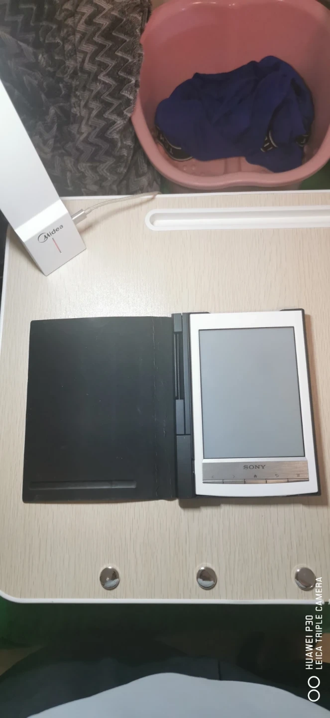 This Sony Reader PRS-T1 digital book reader is white and comes with a black cover. It's a portable device for reading e-books. A handy light is attached for reading in low light.