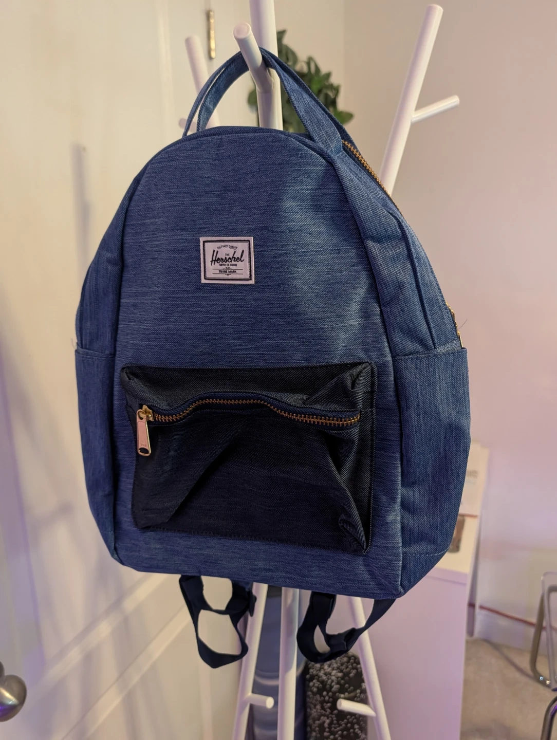Herschel backpack in a blue denim-look material. It features adjustable straps and a front zippered pocket. This mini backpack is perfect for everyday essentials.