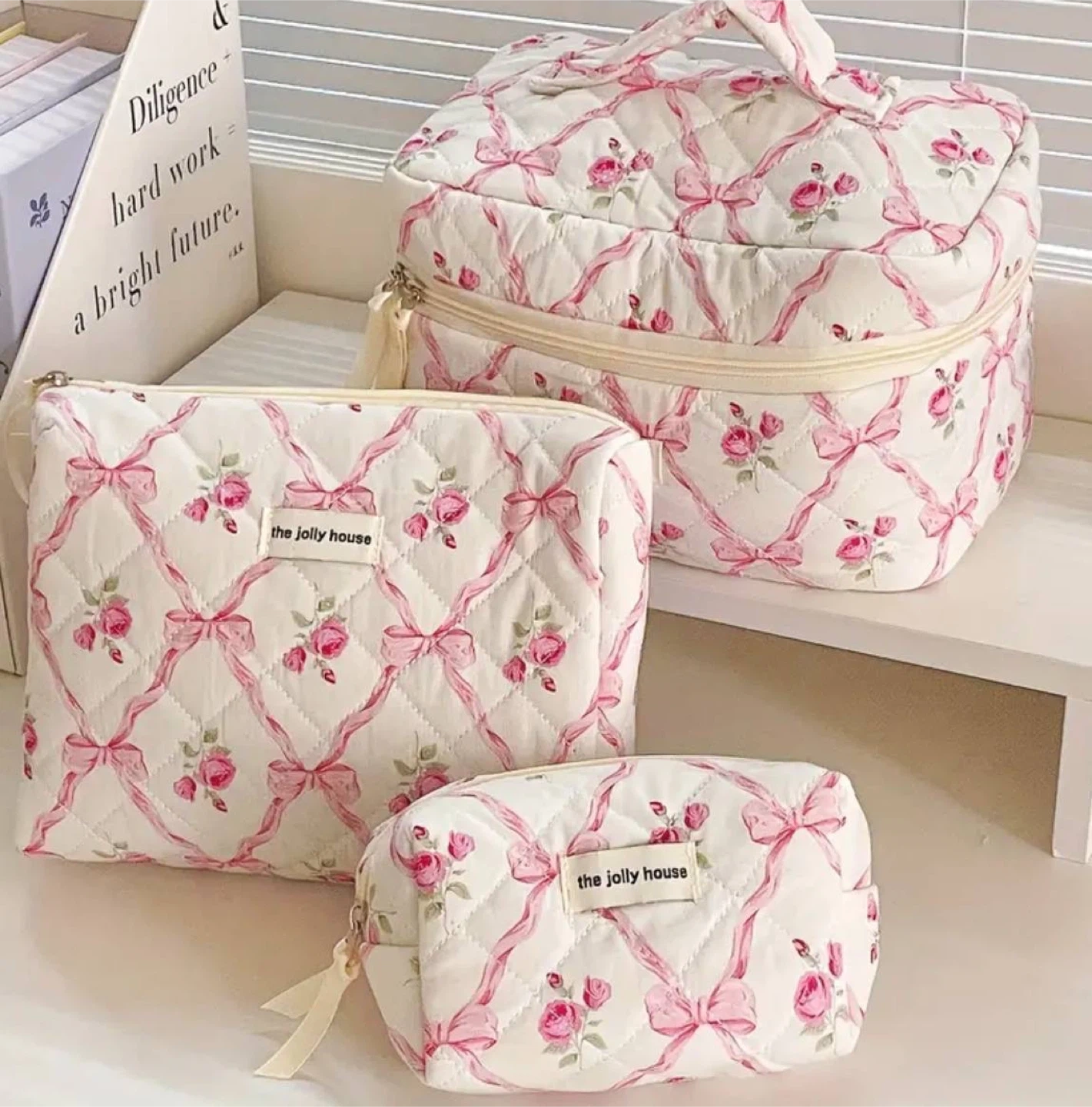 Three quilted cosmetic bags. Features a charming rose and bow pattern. Perfect for travel or organizing your makeup. Zipper closures.