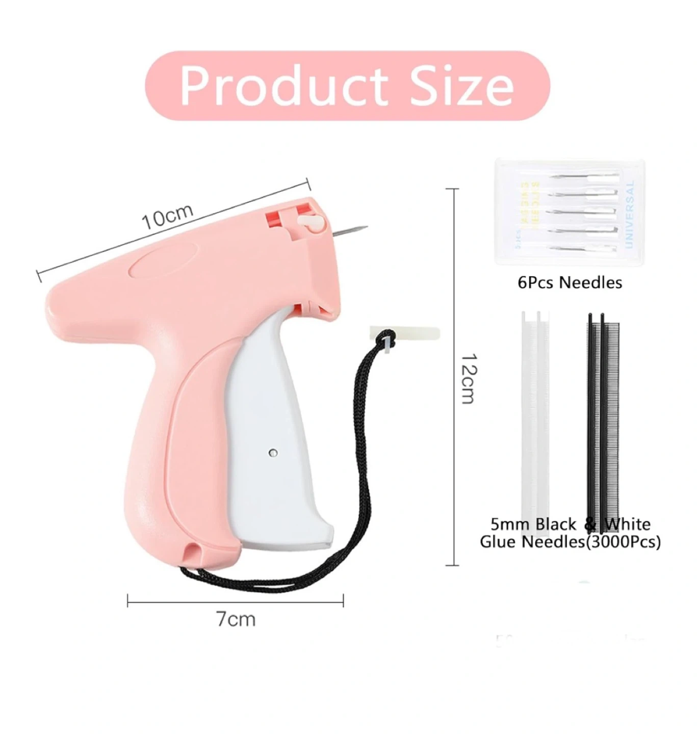 This price tagging gun set includes the gun, 6 needles, and 3000 fasteners (5mm black and white). It's designed for easily attaching price tags and labels to clothing, toys, and home goods. Great for small businesses and crafters!