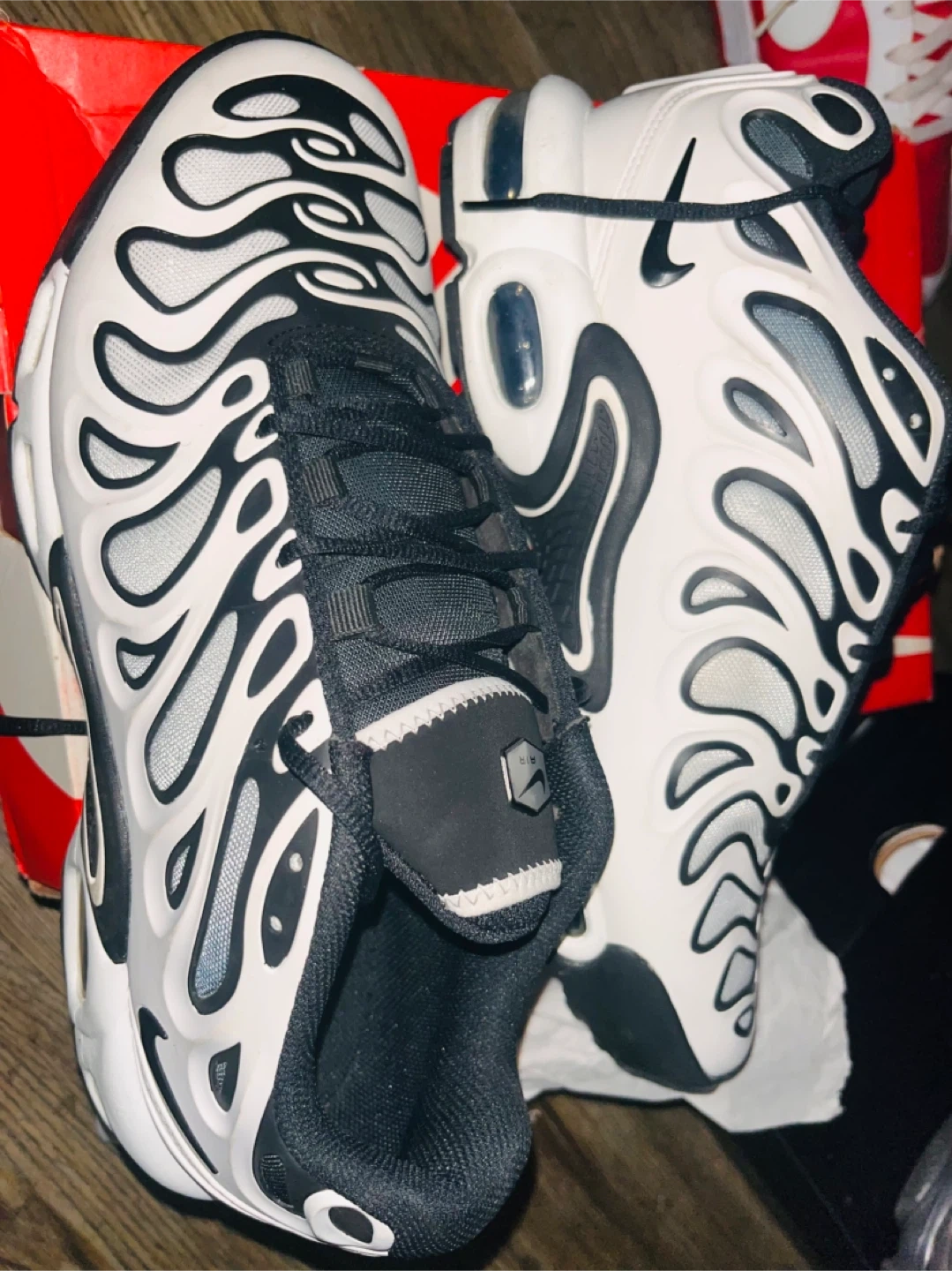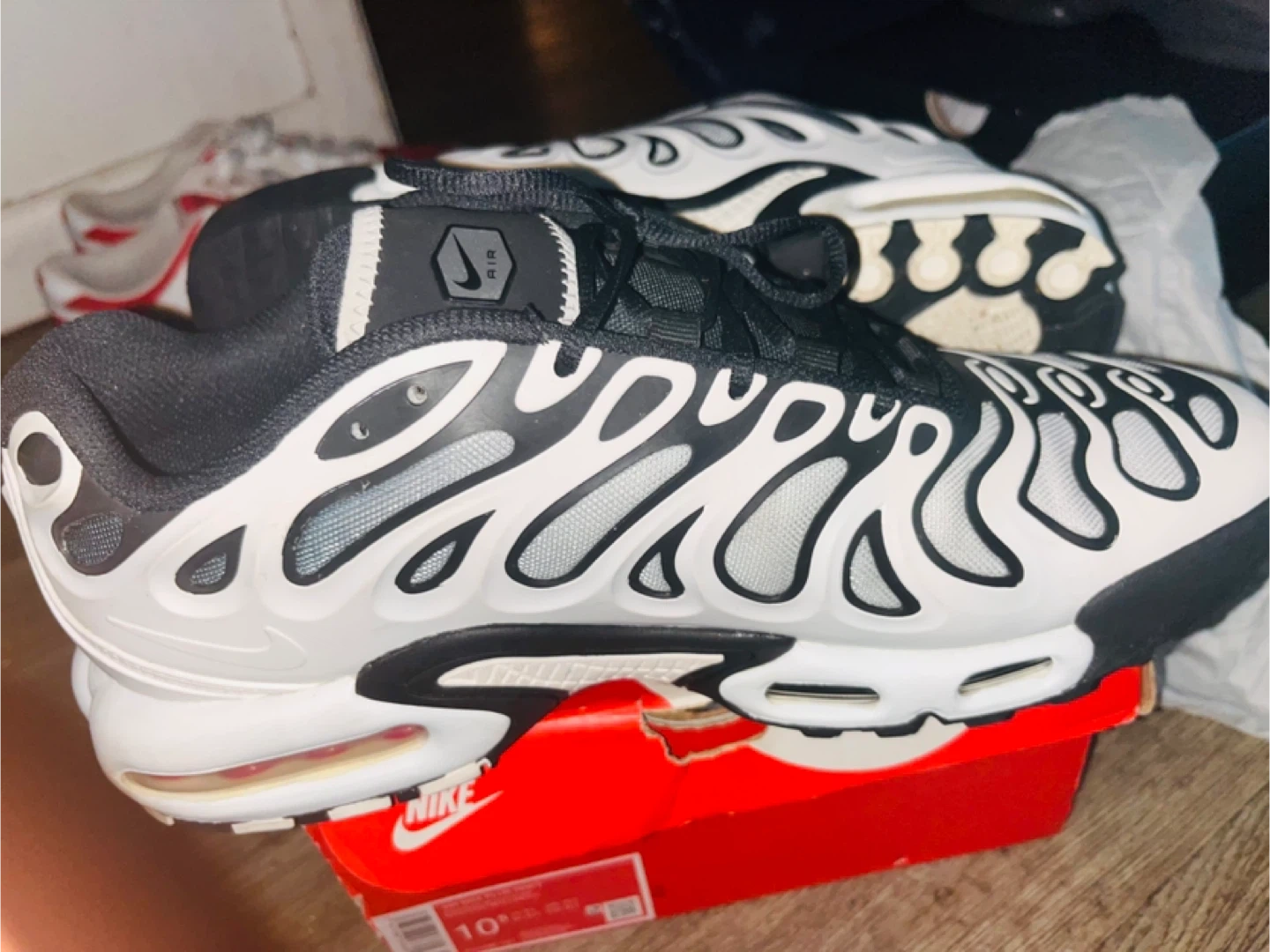 Classic Nike Air Max Plus TN SE running shoes. Features a bold white and black wavy design. Includes original box and Nike Air cushioning for comfort. Great for everyday wear or athletic activities!