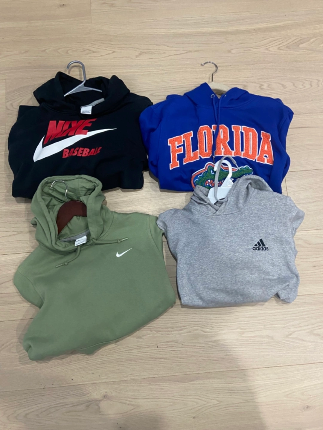Selling a collection of hoodies! There is a Nike Baseball hoodie (black), a Florida hoodie (blue), a Nike hoodie (green), and an Adidas hoodie (grey).
