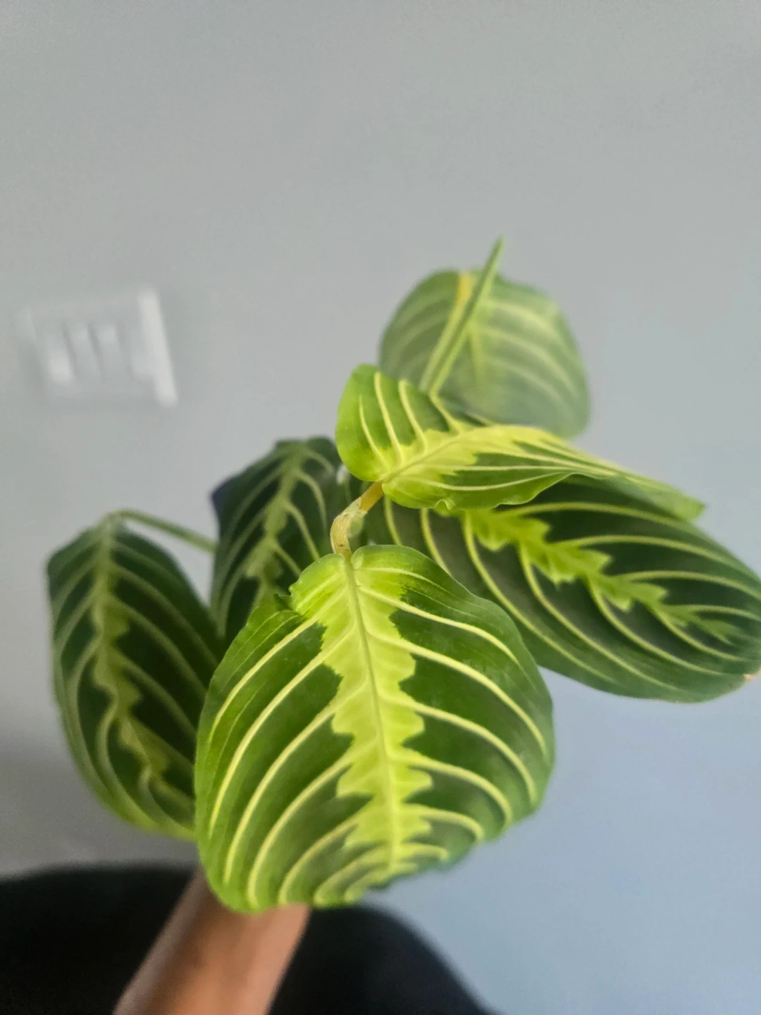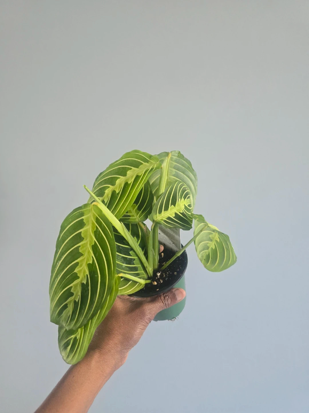 This is a live Lemon-Lime Prayer Plant. It's potted in a green plastic container with soil. The plant features striking green leaves with yellow-lime variegation.