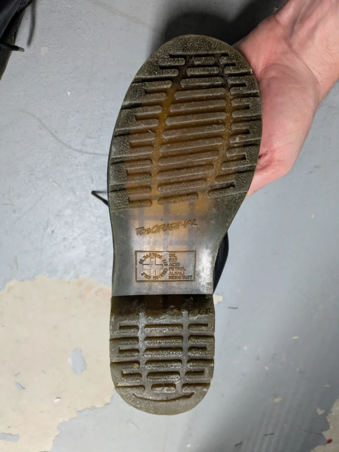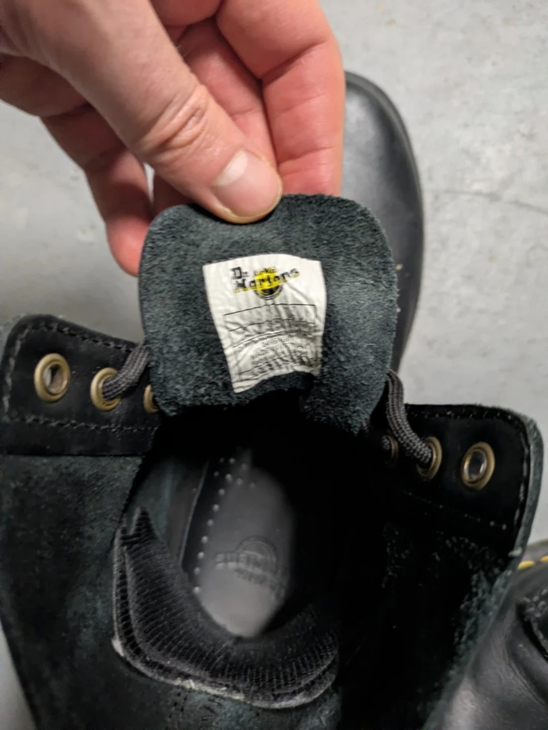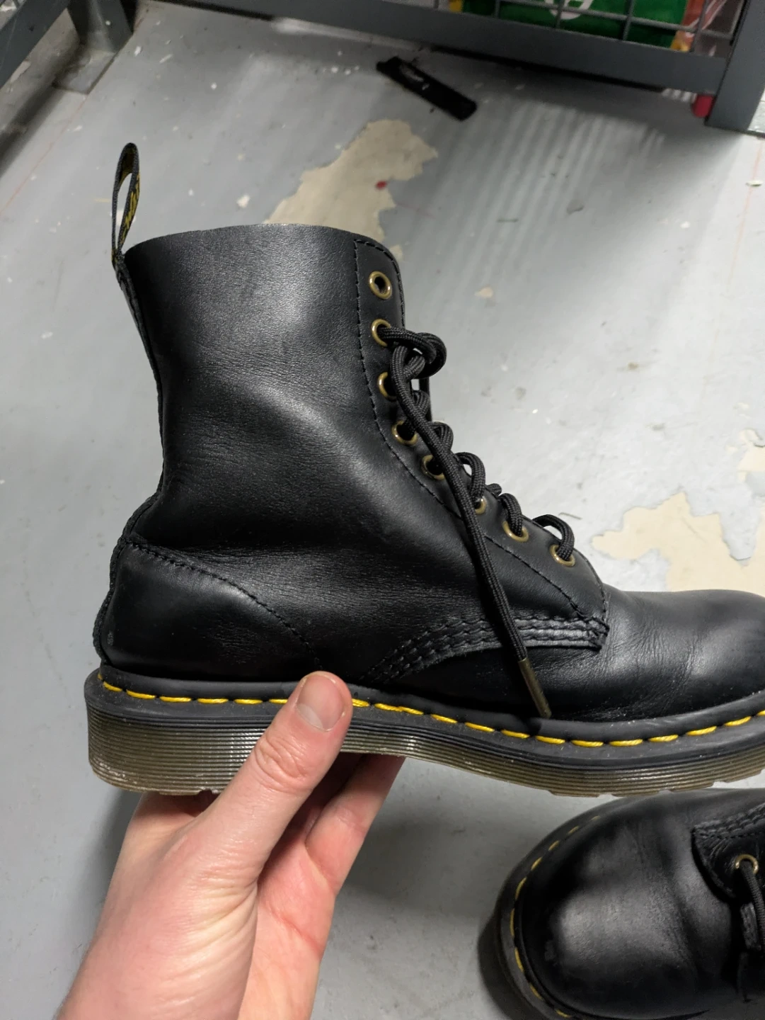 Classic black leather Dr. Martens boots. These boots are made with durable leather and feature the signature air-cushioned sole. Lace-up closure for a secure fit. Great for everyday wear! US size 7