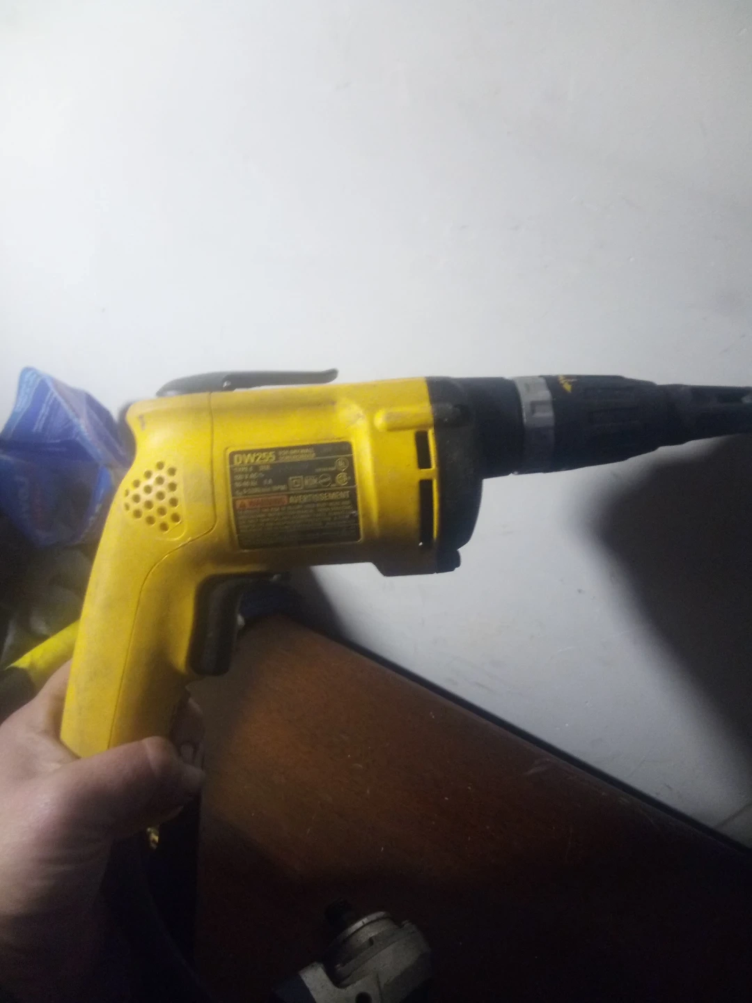 This is a DEWALT DW255 drywall screwgun. It's a yellow power tool designed for driving screws. It has a variable speed trigger and a depth adjustment collar.