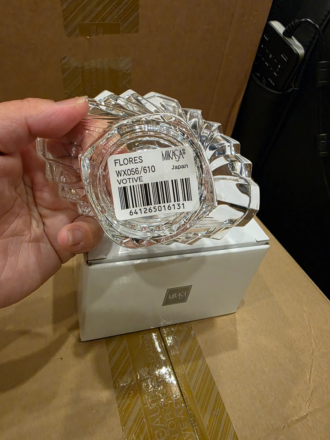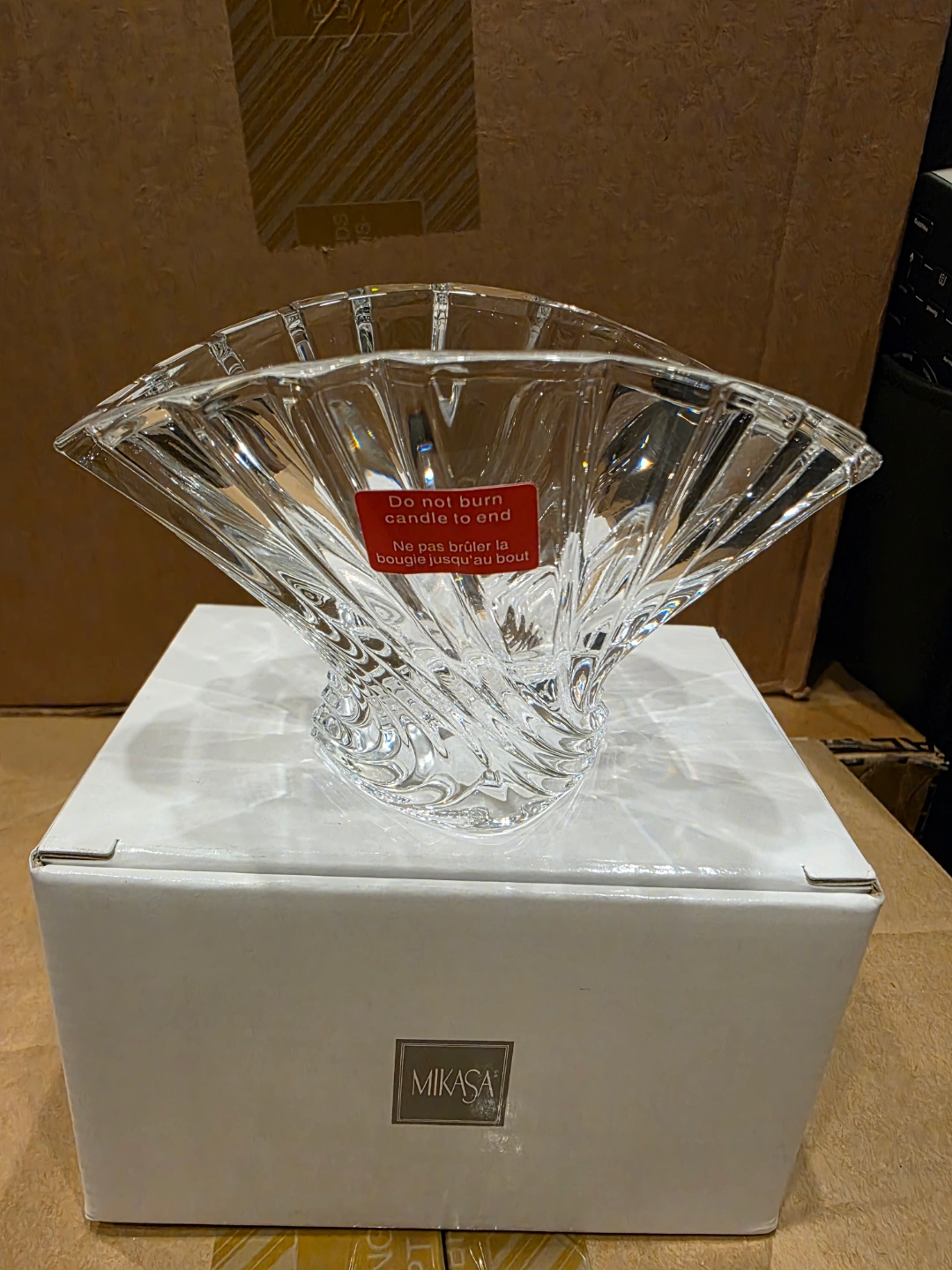 Clear glass votive candle holder. Features a fan-like design. Comes with the original box. A beautiful candle holder can create a warm, inviting atmosphere in any room.