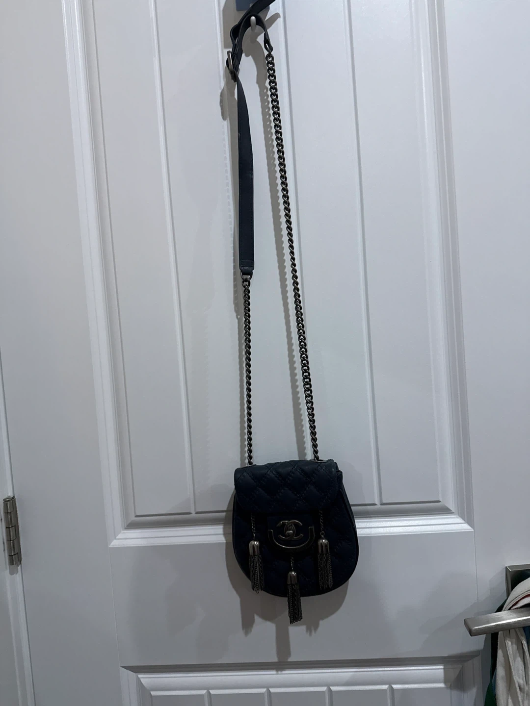 This stylish black crossbody bag features a quilted design and decorative tassels. It has a long silver chain strap, perfect for wearing over the shoulder or across the body. A great accessory for a night out!