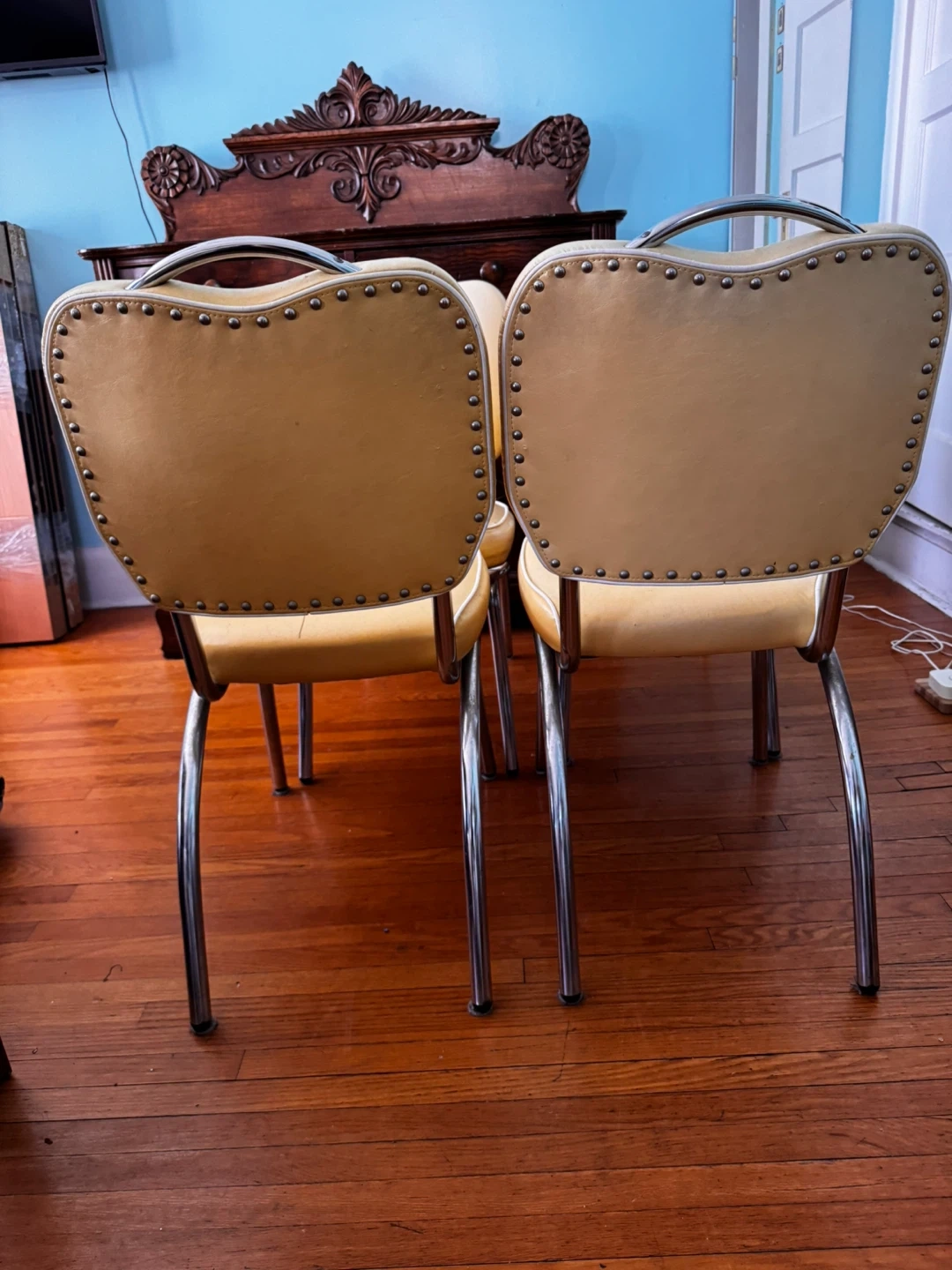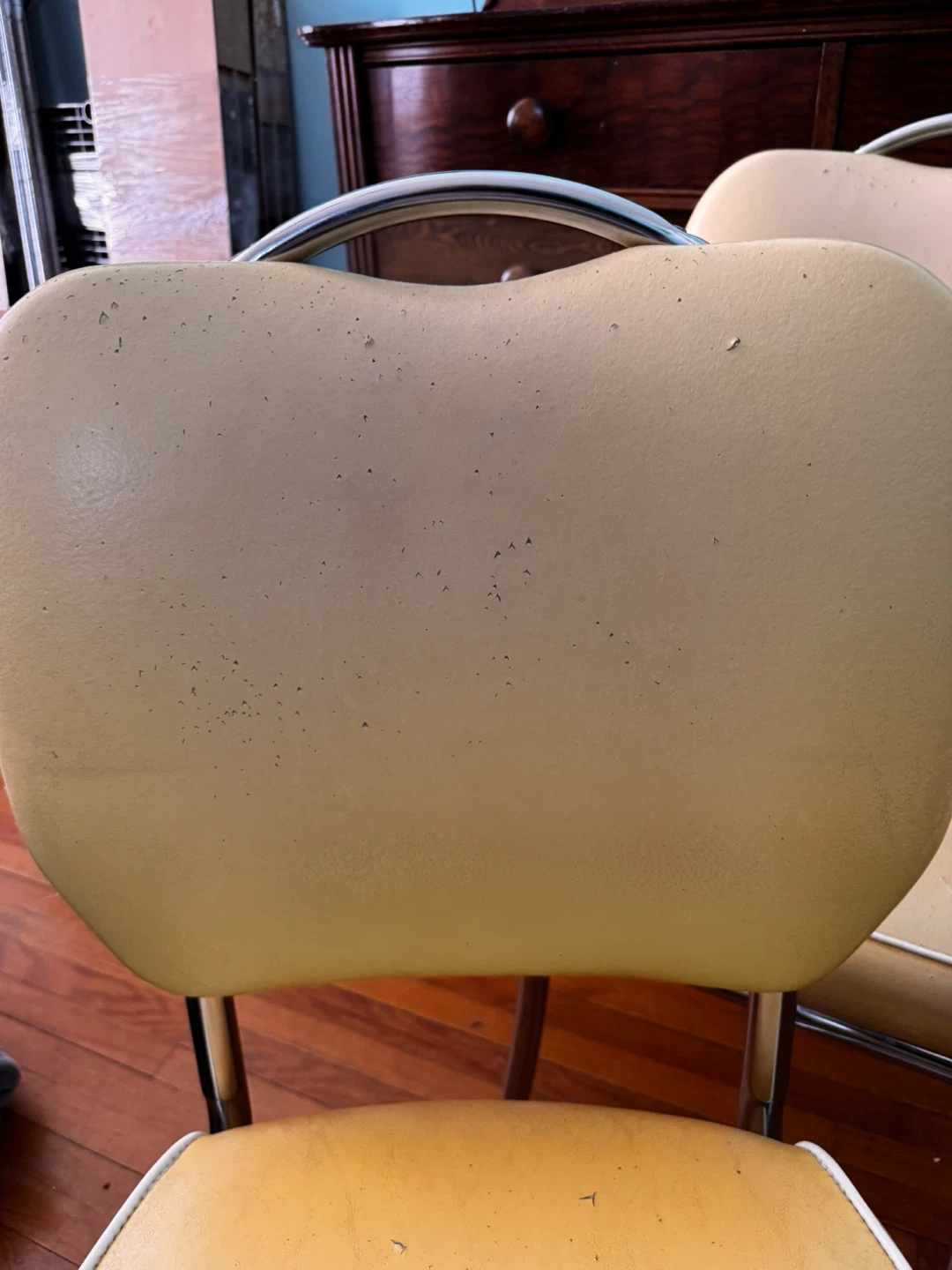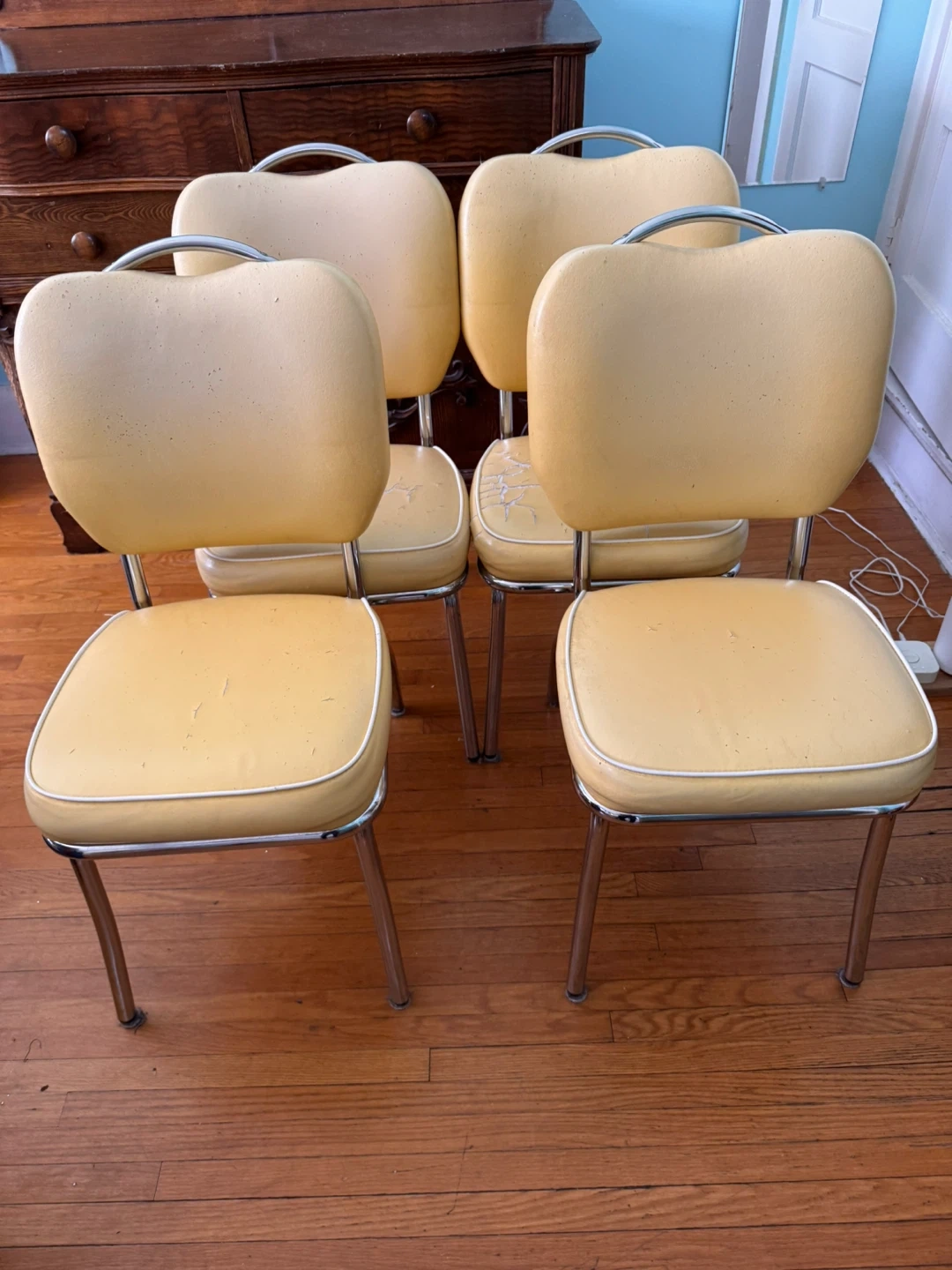 Set of four vintage chairs with yellow vinyl upholstery and chrome legs. These chairs have a classic diner style. Upholstery shows wear with cracking and peeling, especially on the seats.