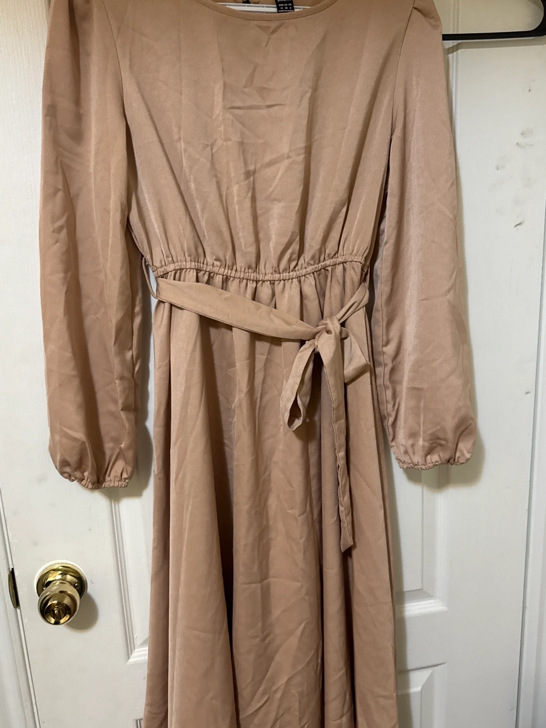 Selling a beige long sleeve dress from Shein! It has a tie at the waist. Great for a night out or a special occasion