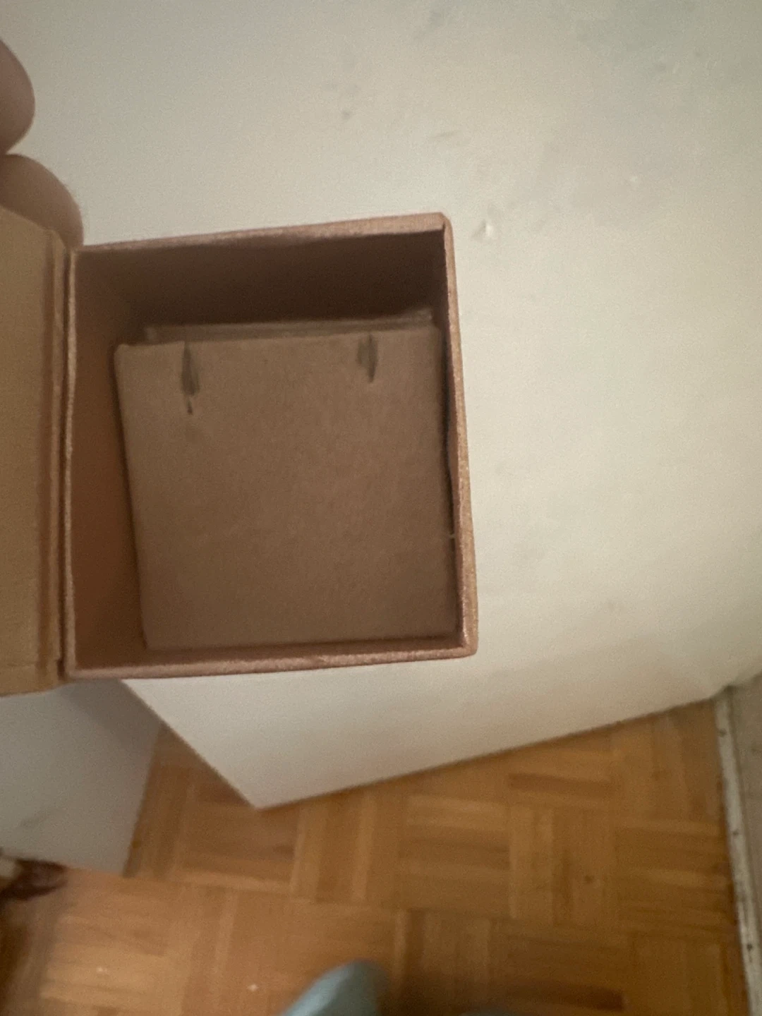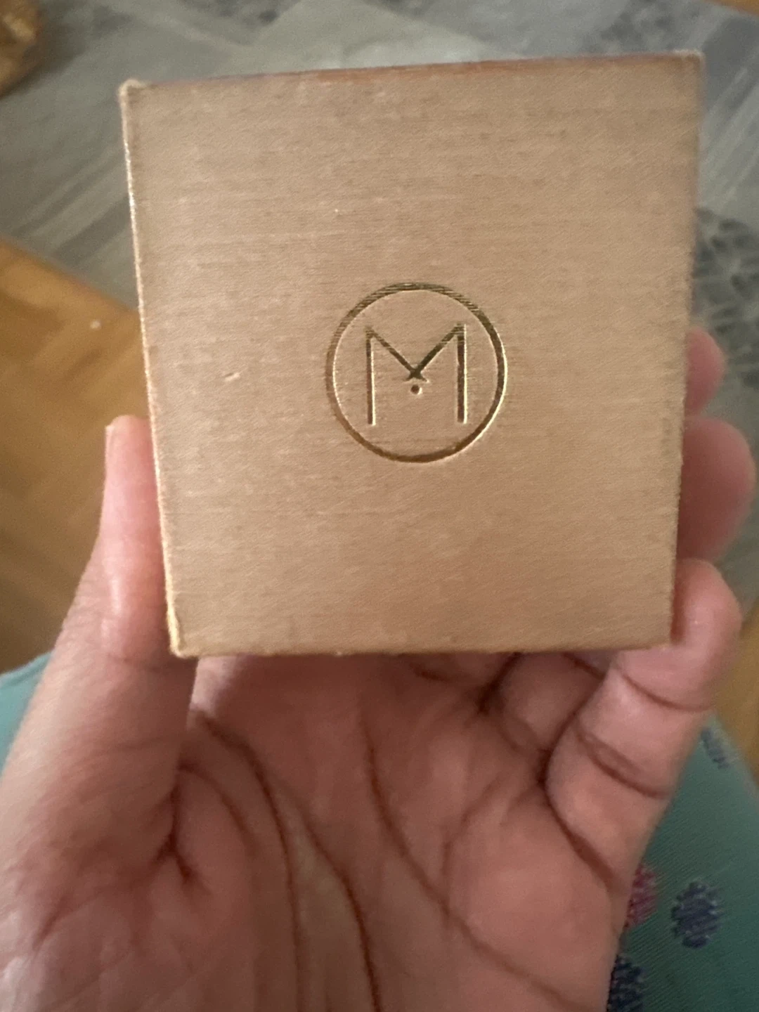 A small, square gift box with a debossed 'M' logo. It's made of a textured, light brown material. This box is perfect for presenting small gifts or keepsake.