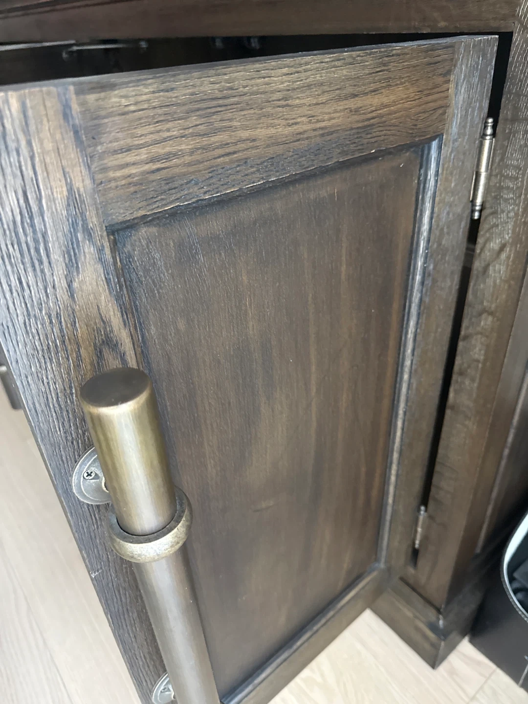 Antiqued Grey Oak and Brown Oak cabinets constructed of solid oak finish constructed of solid hardwood