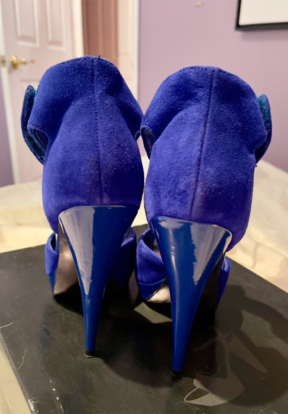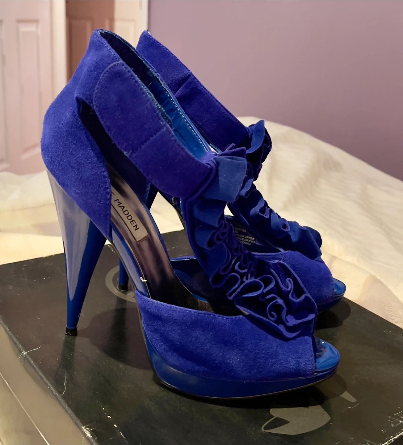 These Steve Madden heels are a vibrant blue and feature a cute ruffle detail. They are a size 8.5 and come with the original box. There are some signs of wear on the soles, but they're still ready for a night out!