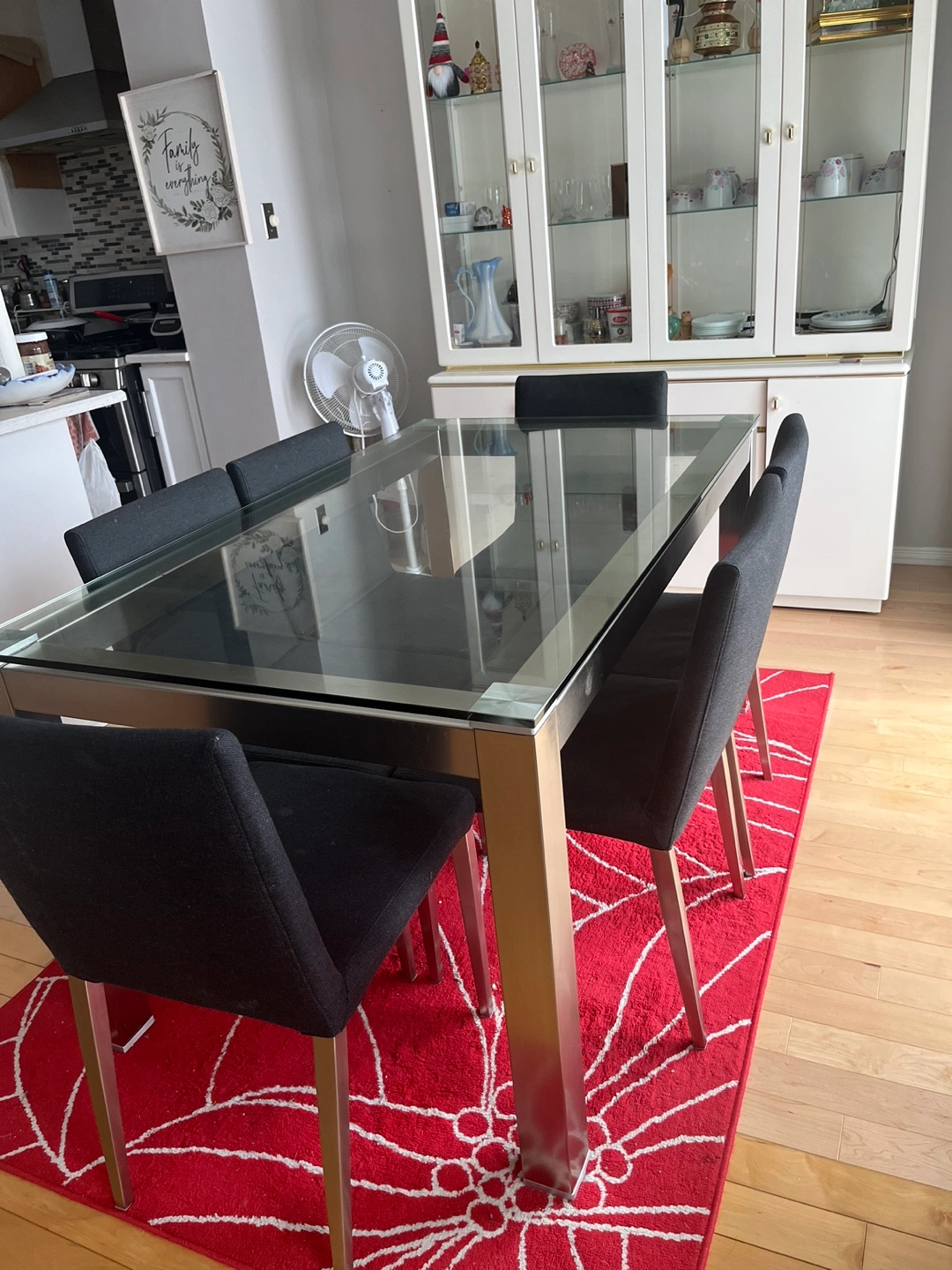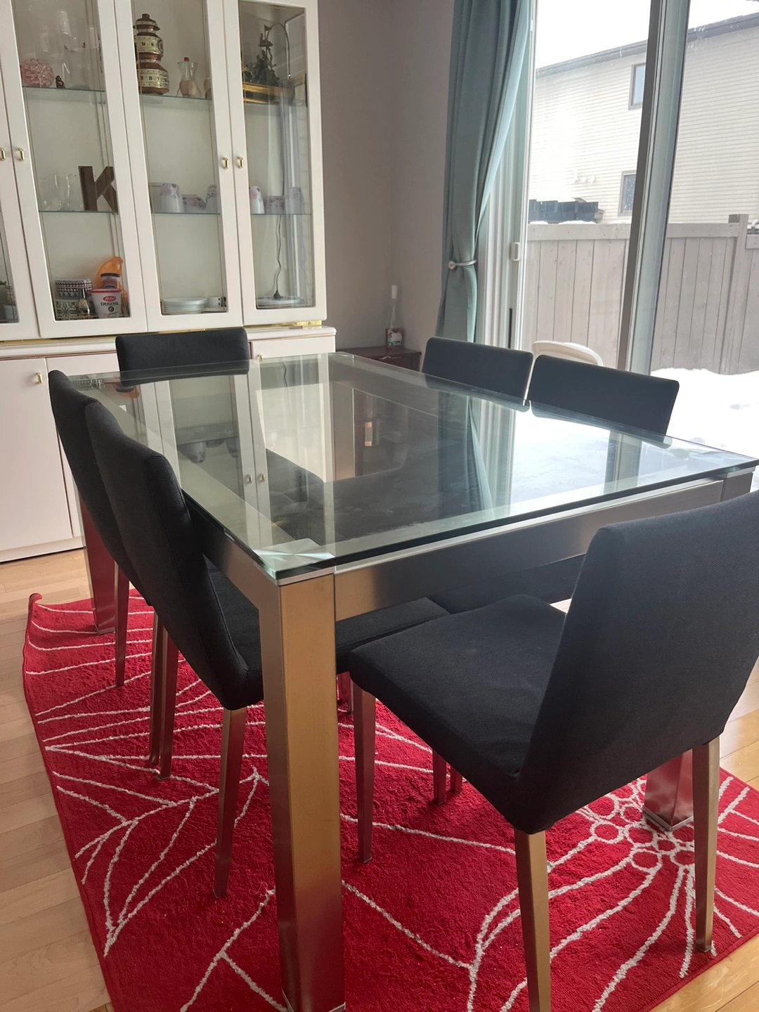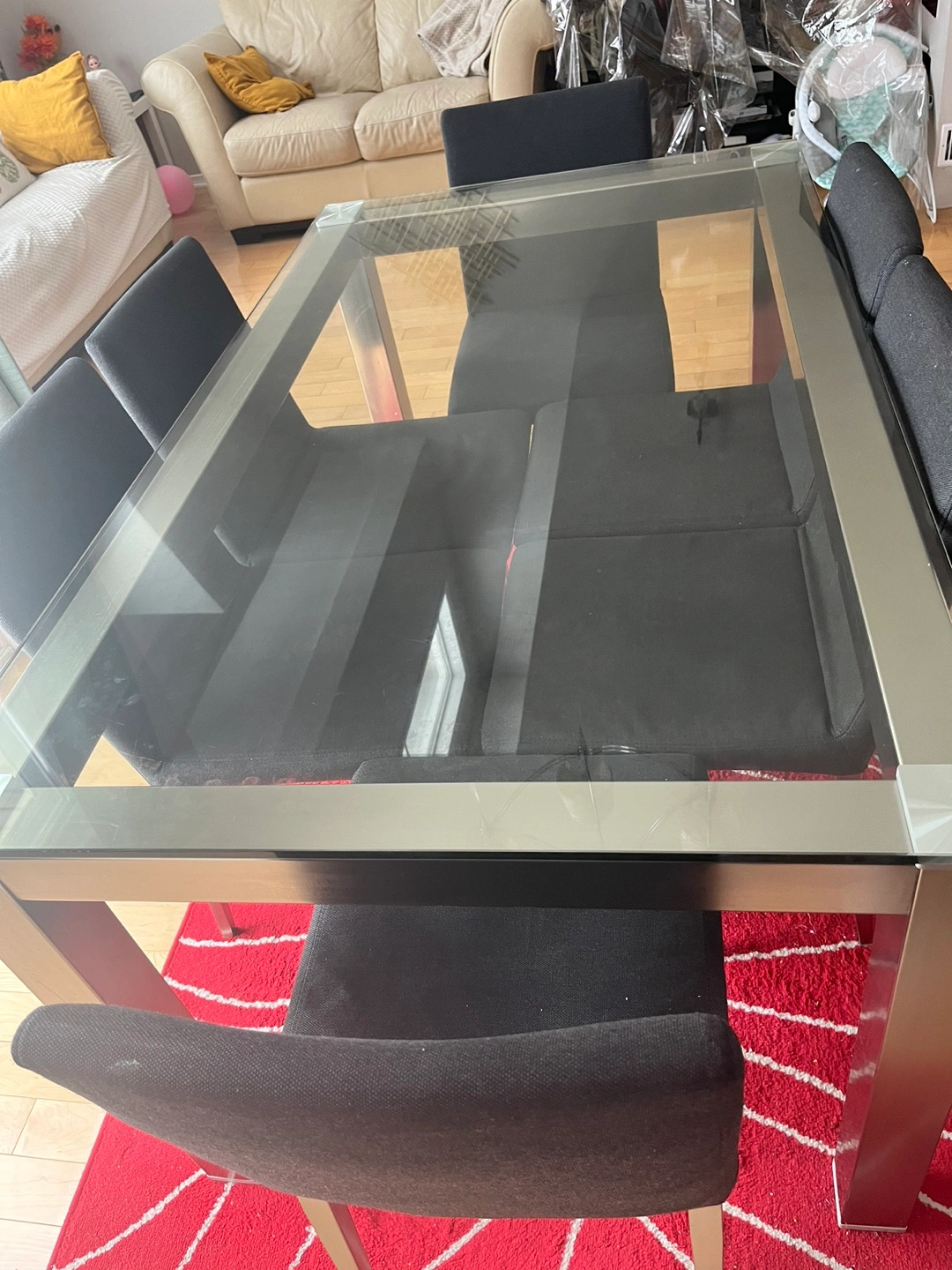 Glass top dining table with six chairs