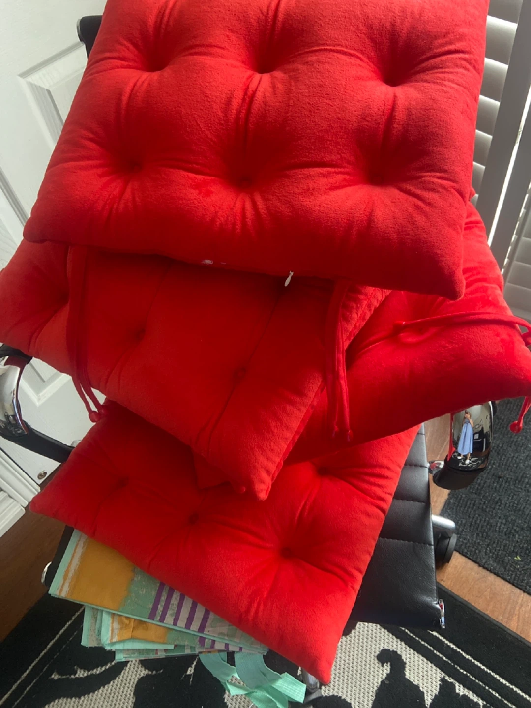 Set of five red tufted chair cushions. These soft cushions add comfort and style to any seating. They're perfect for dining chairs, office chairs, or patio furniture. Each cushion features a plush, tufted design with ties for secure placement.